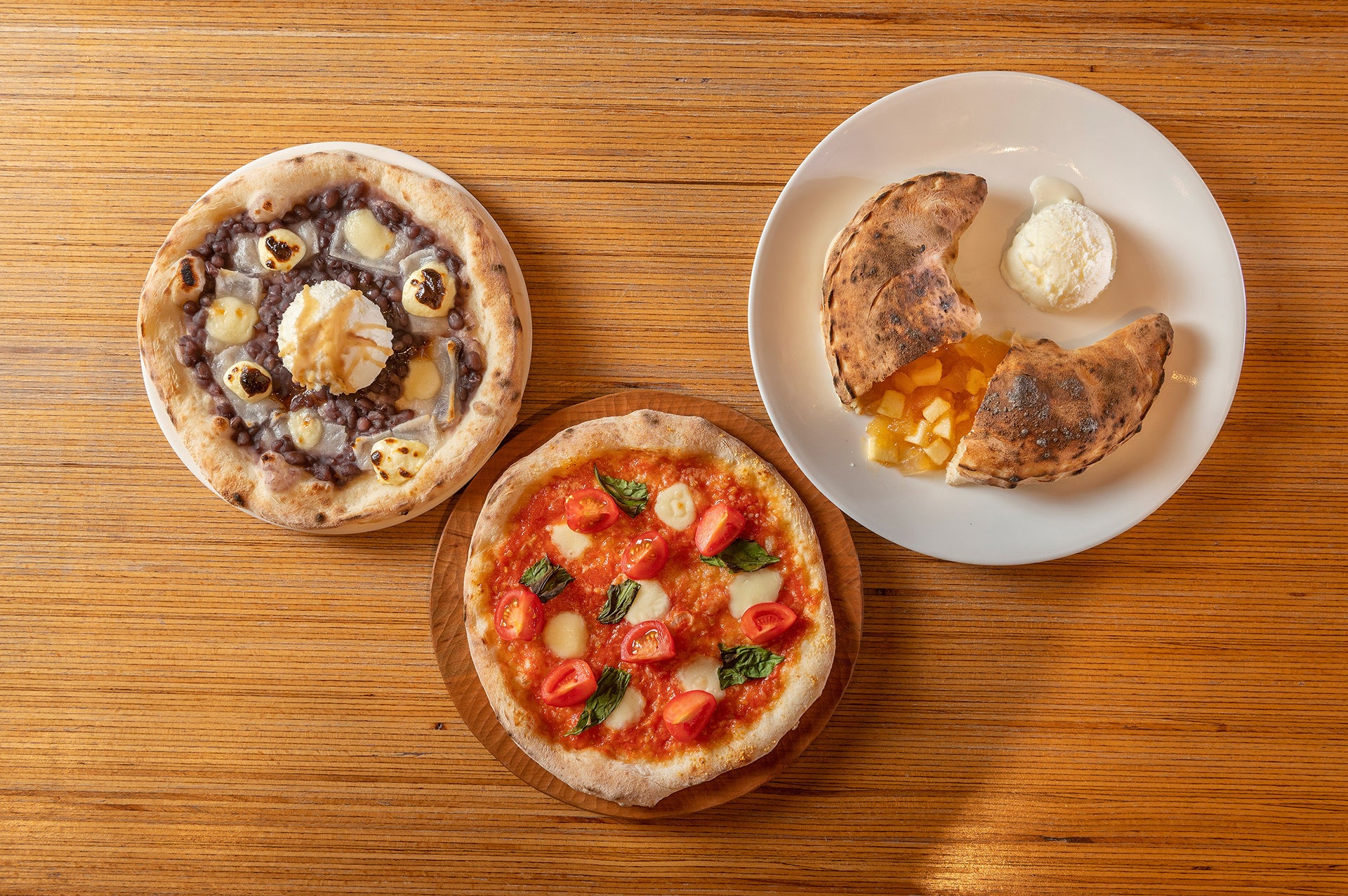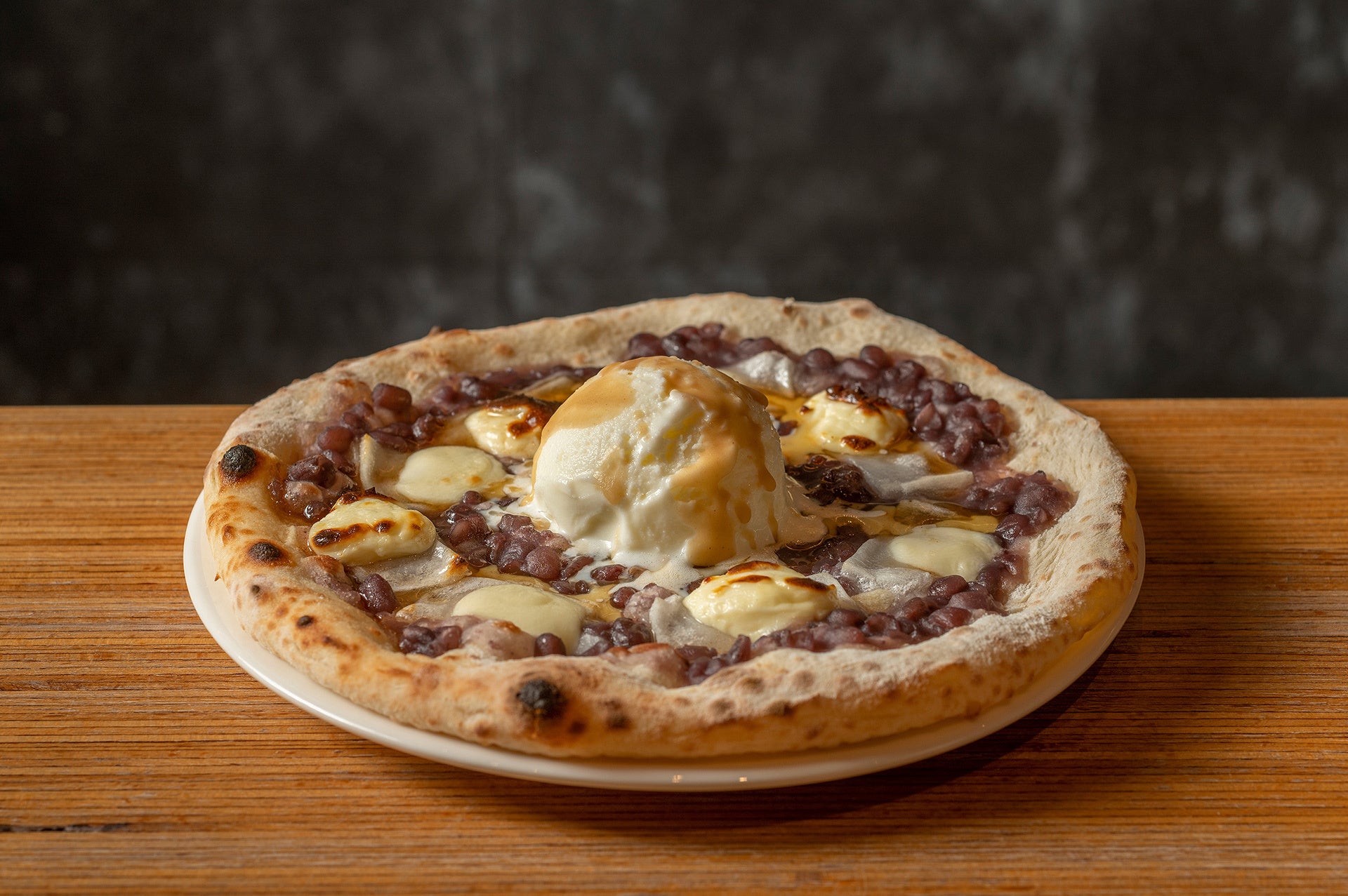 日本国内でも珍しい和スイーツピッツァは、独自配合のピザ生地の上に、自社製の「北海粒餡」とスライスしたお餅、さらにモッツァレラとクリームチーズの2種類のチーズをのせて焼いた「あんこのピッツァ」です。仕上げに濃厚で芳醇な焦がしバターソースの風味をお楽しみください。※イートイン限定で、ピッツァの中央にバニラアイスをのせて提供いたします