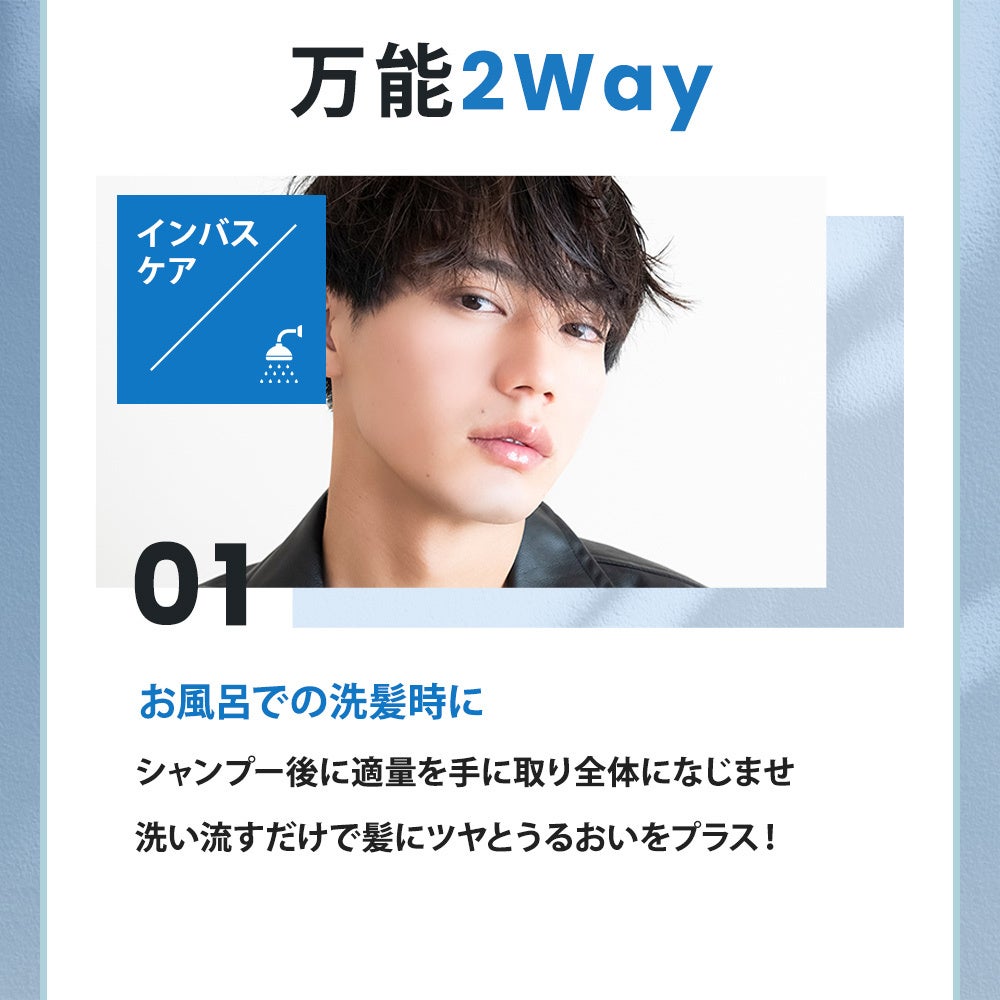 本商品は、保湿と補修の2つのアプローチで髪をケアし、広がりを抑えてまとまりのある髪をキープする2Wayトリートメントです。シャンプー後のインバストリートメントとしても、タオルドライ後のアウトバストリートメントとしても使用可能。紅茶とシトラスをベースにした爽やかなホワイトティーの香りが、ケアタイムをリラックスできるひとときへと導きます。