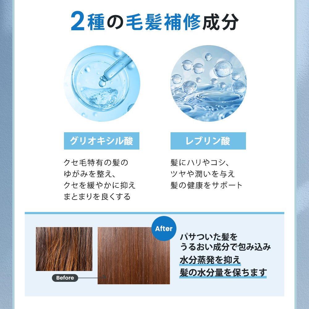 サロンケアのトリートメントと同じ成分(グリオキシル酸、レブリン酸)を使用。保湿×補修のWケアで広がらないまとまり髪へ。
