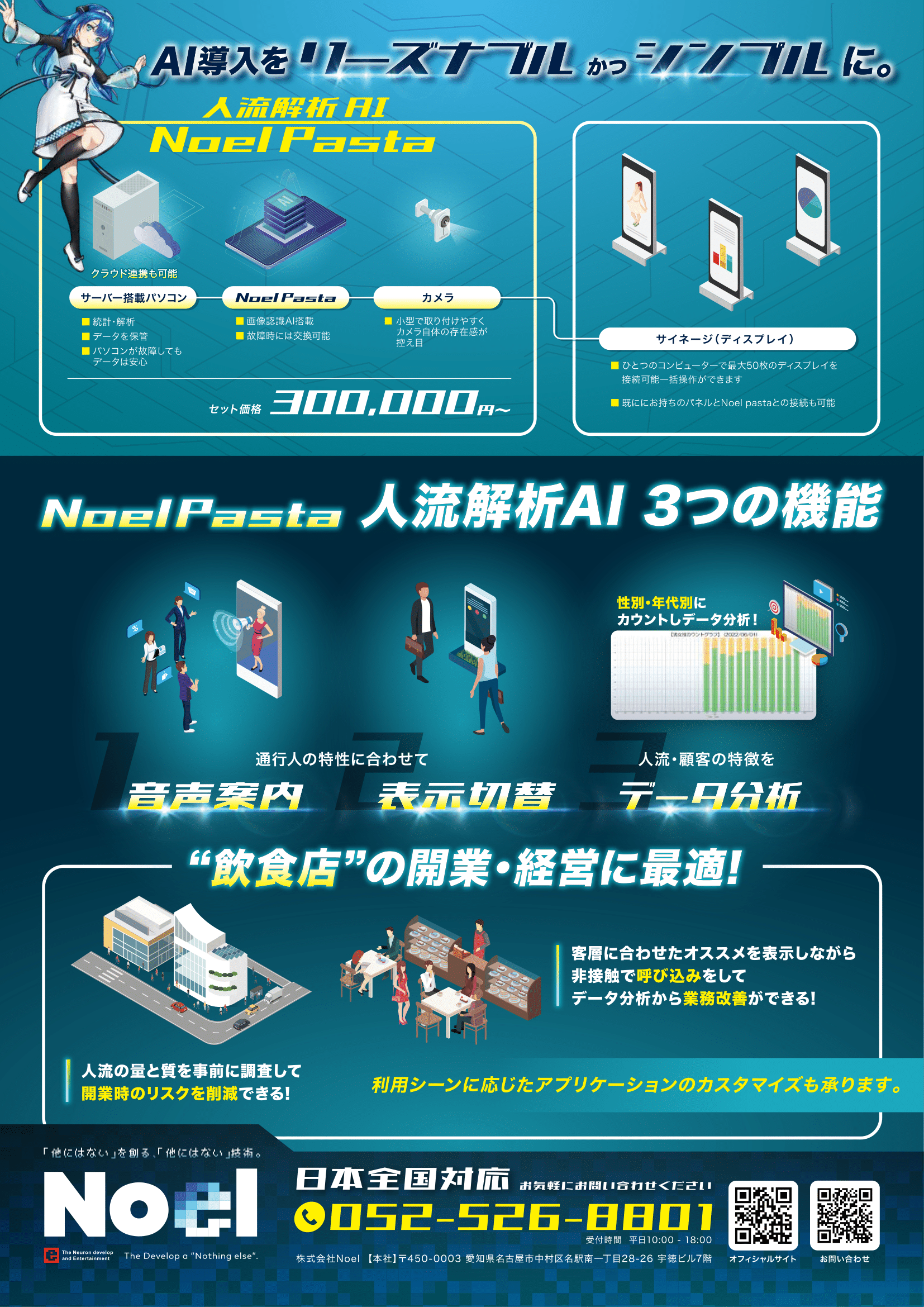 株式会社Noel(本社:愛知県名古屋市中村区名駅南、代表取締役社長:竹村 智康)は、東京ビッグサイト(江東区・有明)にて開催されたJAPAN MOBILITY SHOW 2023(一般公開:10月28日~11月5日)にて、株式会社ジェイテクト(本社:愛知県刈谷市、取締役社長:佐藤和弘、以下「ジェイテクト」)ブースにおいて、自社開発AIである人流解析システムNoelPastaが導入れました。