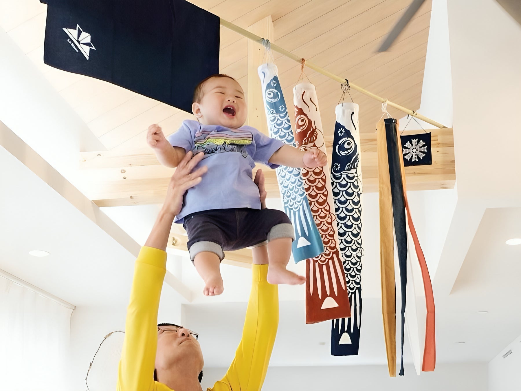 LaManoの鯉のぼりは、国産の藍のみで染めた真鯉と、水色の子鯉、植物の茜で染めた緋鯉と、五色の吹き流し、魔よけの意味がある矢車飾りからなる、セット商品です。