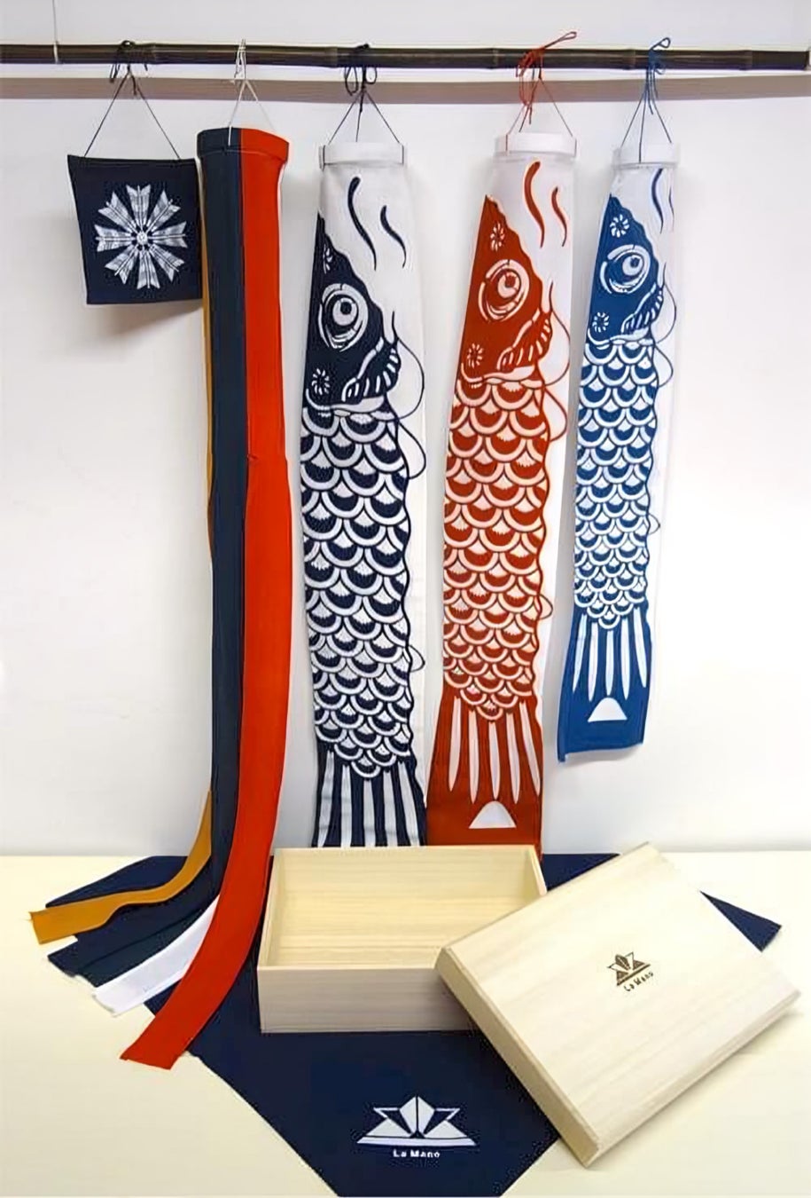 障がいのある方々の、手しごとによる制作を行うクラフト工房LaManoは『草木型染鯉のぼり・プレミアム5点セット+桐箱・風呂敷付き』を50セット限定、『草木型染鯉のぼり5点セット』を50セット限定で、3/7より追加予約販売いたします。