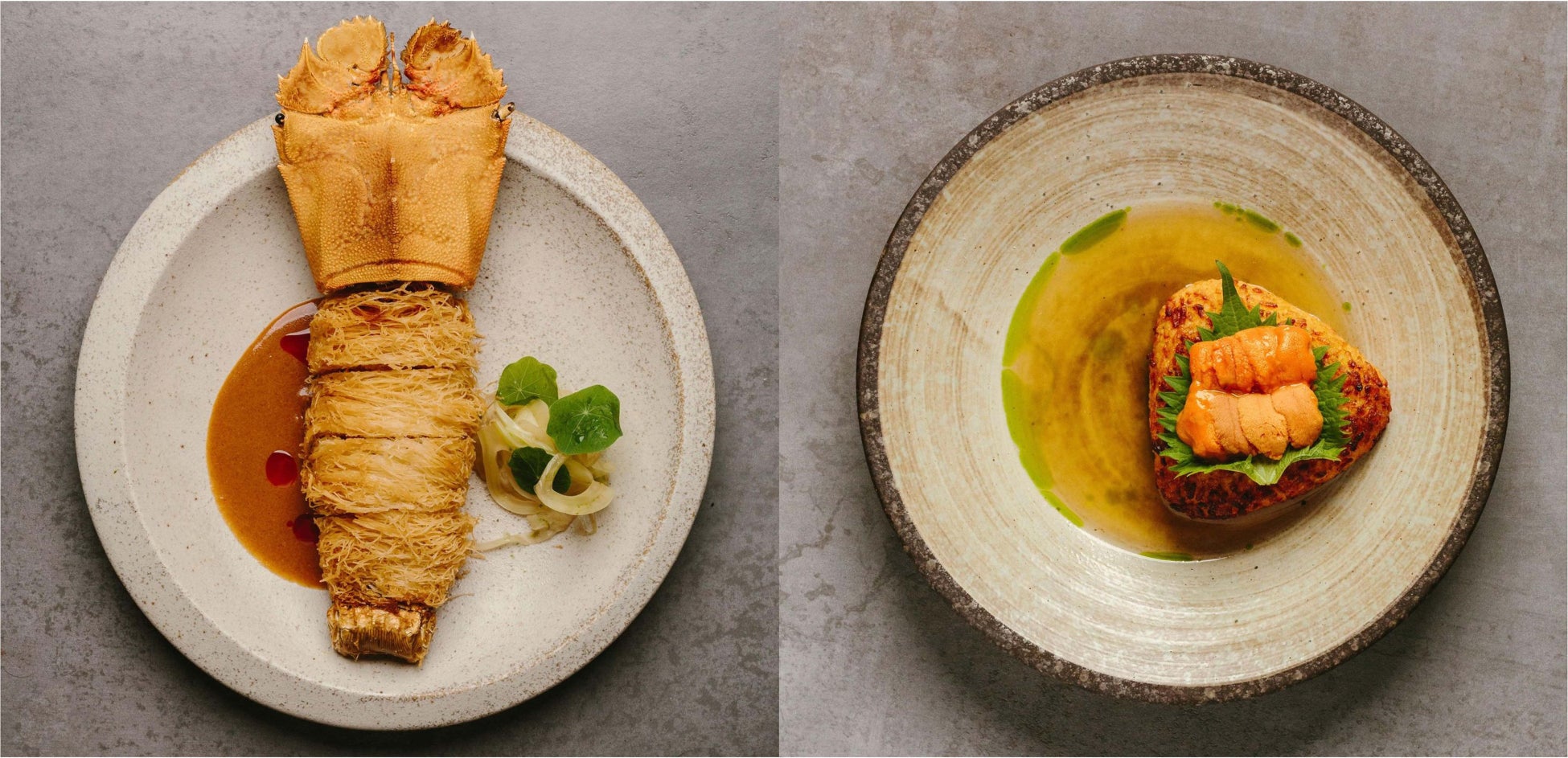 (左)うちわエビのカダイフ揚げ ソースビスク、(右)うにぎり 焼きおにぎり 鮑のソース