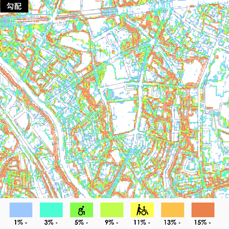 そこで今回は、Accessibility Mapとして、車道・歩道のネットワークデータをベースに単位時間でどこまで到達できるのかを属性・速度別に表示させた到達圏マップ(図1)と、道路の勾配角度を表示させた勾配マップ(図2)を作成しました。また、それらのマップを活用しながら、生徒自身が街歩きをして得られた気づきを避難経路の歩行容易性を地図上に表現しました(図3)。