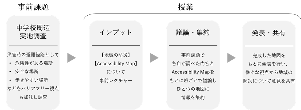 【バリアフリー視点×自身の体験×データ】を掛け合わせて検討し、生徒同士の対話を通じて、様々な生活者にとっての地域防災について、新たな気づきが得られるプログラムとなっています。