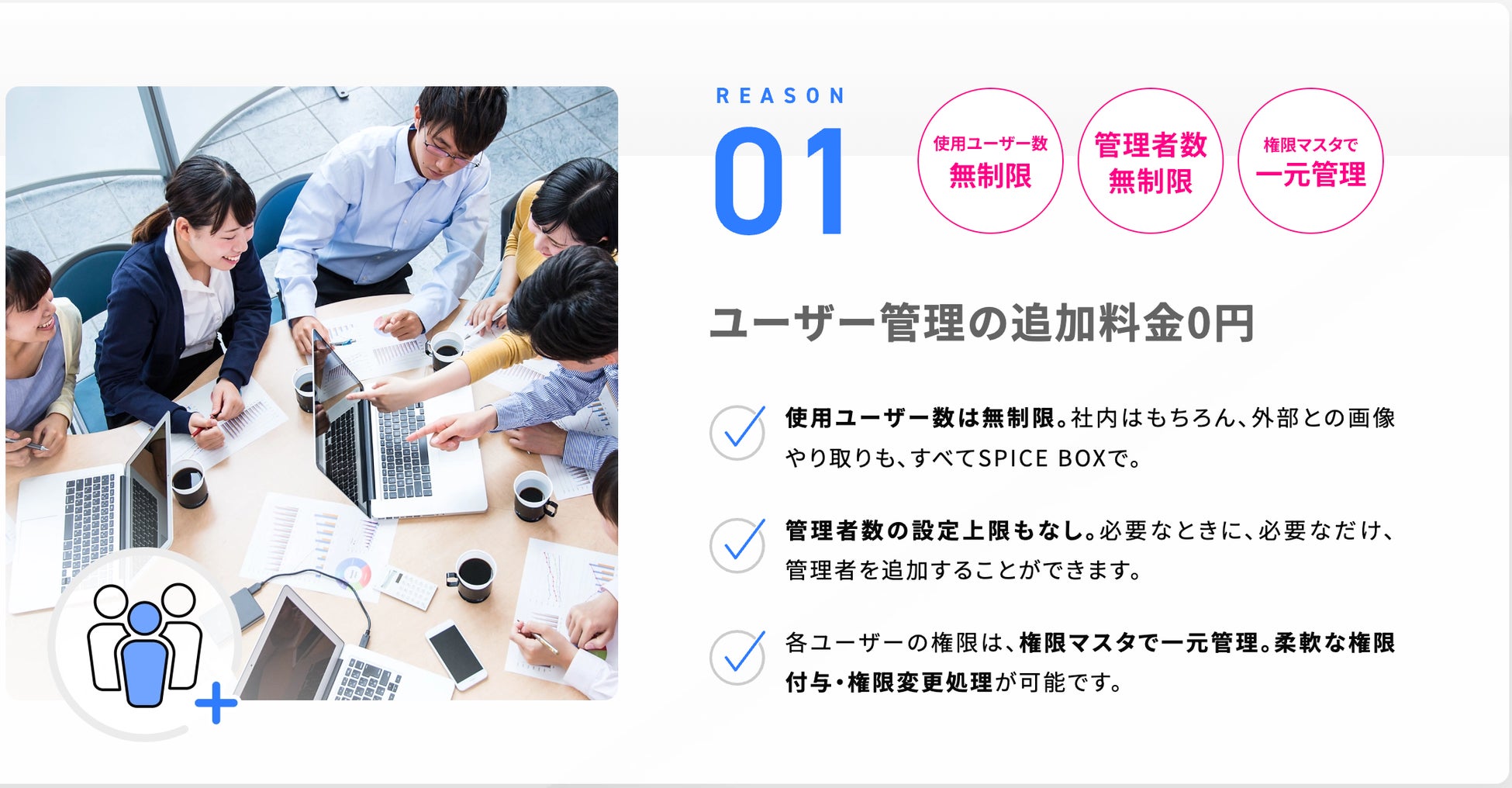 ファイル管理・共有に関するあらゆる課題を解決した「SPICE BOX」では、当ツールならではの特徴があります。