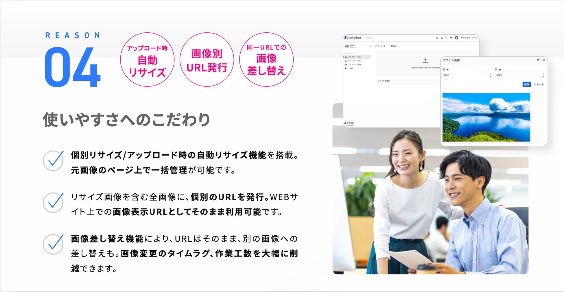 特徴4:アップロードしたファイルの自動リサイズやURL化が可能
