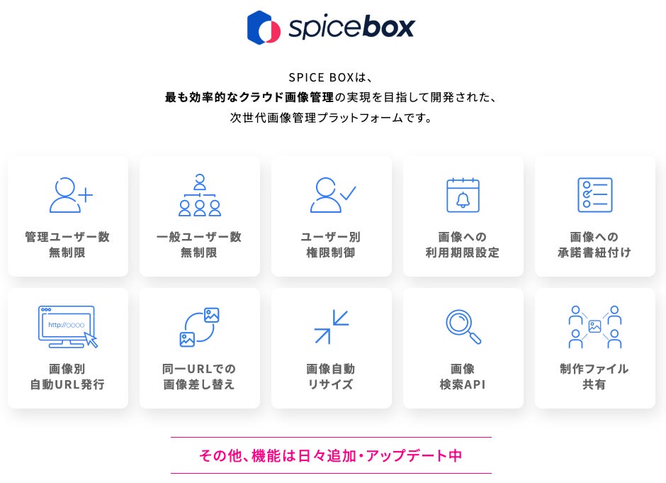 新たにリリースする「SPICE BOX」は、画像や動画を始めとするあらゆるファイル管理・共有の課題を解決する最新のツールです。あらゆるファイルのアップロード、ダウンロード、共有、編集などを全て一元管理することで、ビジネスの効率化と成果の最大化を支えます。