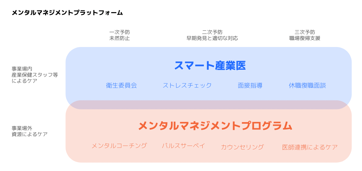 主軸となっているのは、メンタルヘルスケアに特化した産業医サービス「スマート産業医」・一人ひとりのメンタルの不安や悩みの課題解決をサポートする「メンタルマネジメントプログラム」の2サービス。この二つのサービスを組み合わせることにより、従業員のメンタル問題が重大になる前に未然に防ぎ、企業活動が円滑に進む世界を、生産性高く実現しております。