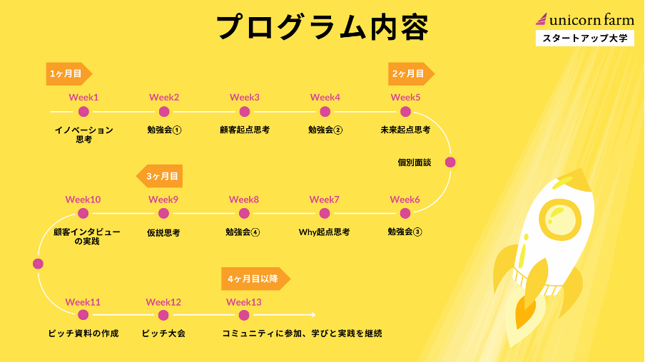 ユニコーンファームは2017年の創業以来、これまでの数多くのスタートアップ/新規事業のメンタリング実施の経験から、多くの起業家/起業志望の方が、そもそもの考え方・意識や基礎知識不足により事業を推進できないことを発見しました。そこで日本のスタートアップ・エコシステムの成長のためには、徹底的に基礎を学べる入門プログラムが必要と感じ、この講座を企画いたしました。