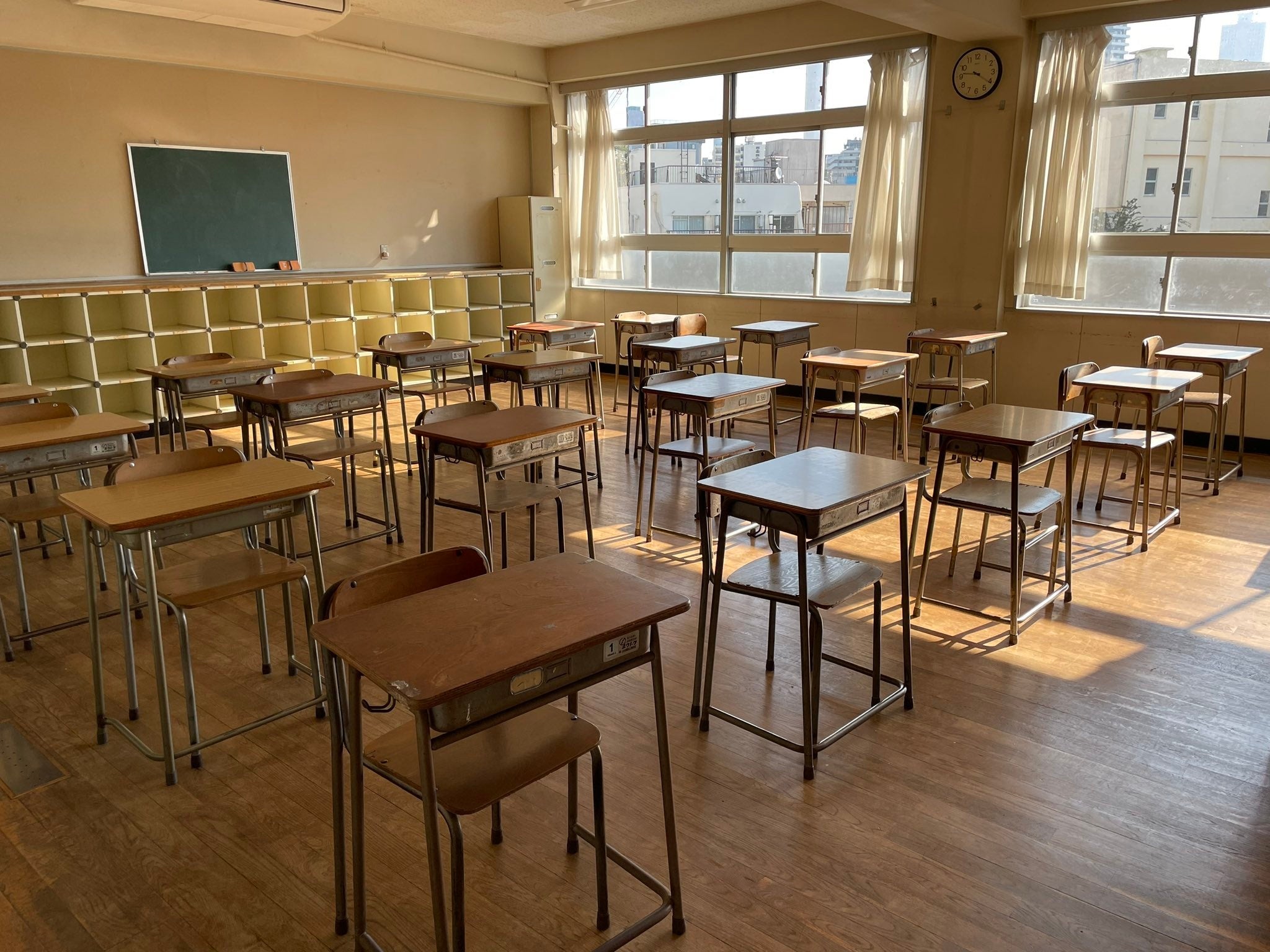 日当たりがよく、日中はきれいに自然光が入る教室空間です。机・椅子や教卓などもあるので
