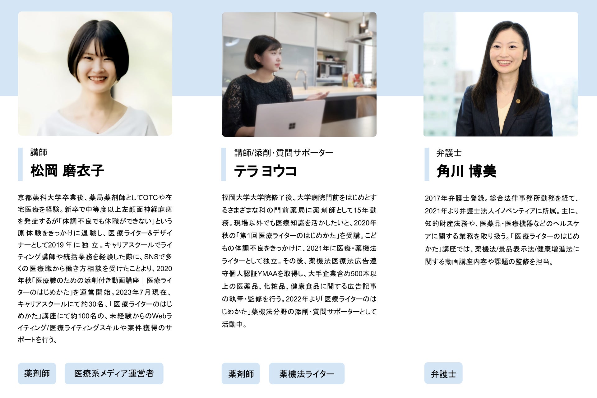 その後、医療ライターや医療関連のデザイン業務を行うようになりましたが、キャリアスクールで講師や統括業兼務時にコロナ禍が始まり、SNS経由で医療職の方から働き方に関する相談を多くいただくように。それをきっかけに2020年11月、「医療ライターのはじめかた」オンライン講座をスタートし3年ほど継続運営。卒業した医療資格保有者は、薬剤師・看護師・歯科医師・歯科衛生士・理学療法士・臨床検査技師など、合計約100名となりました。