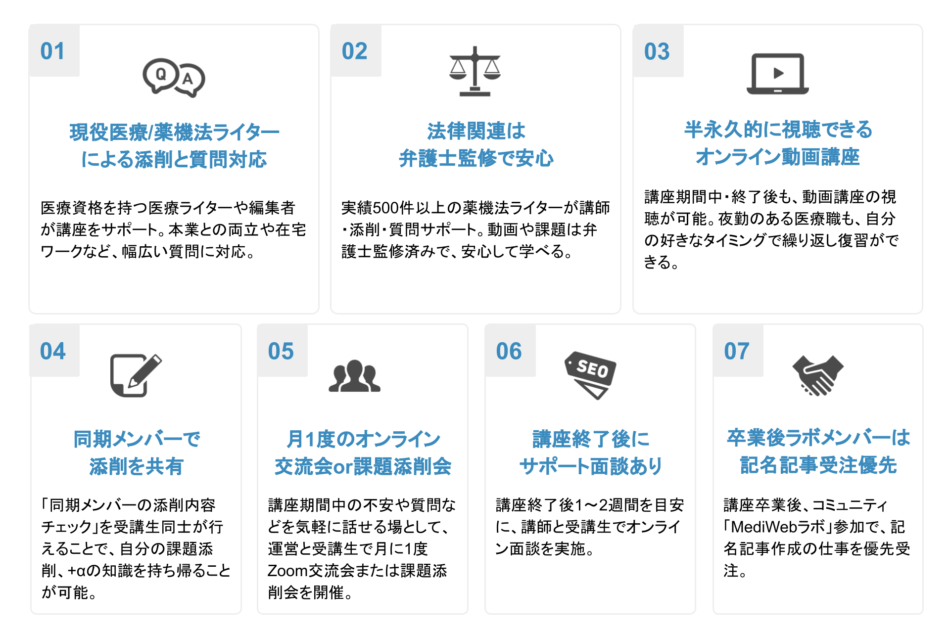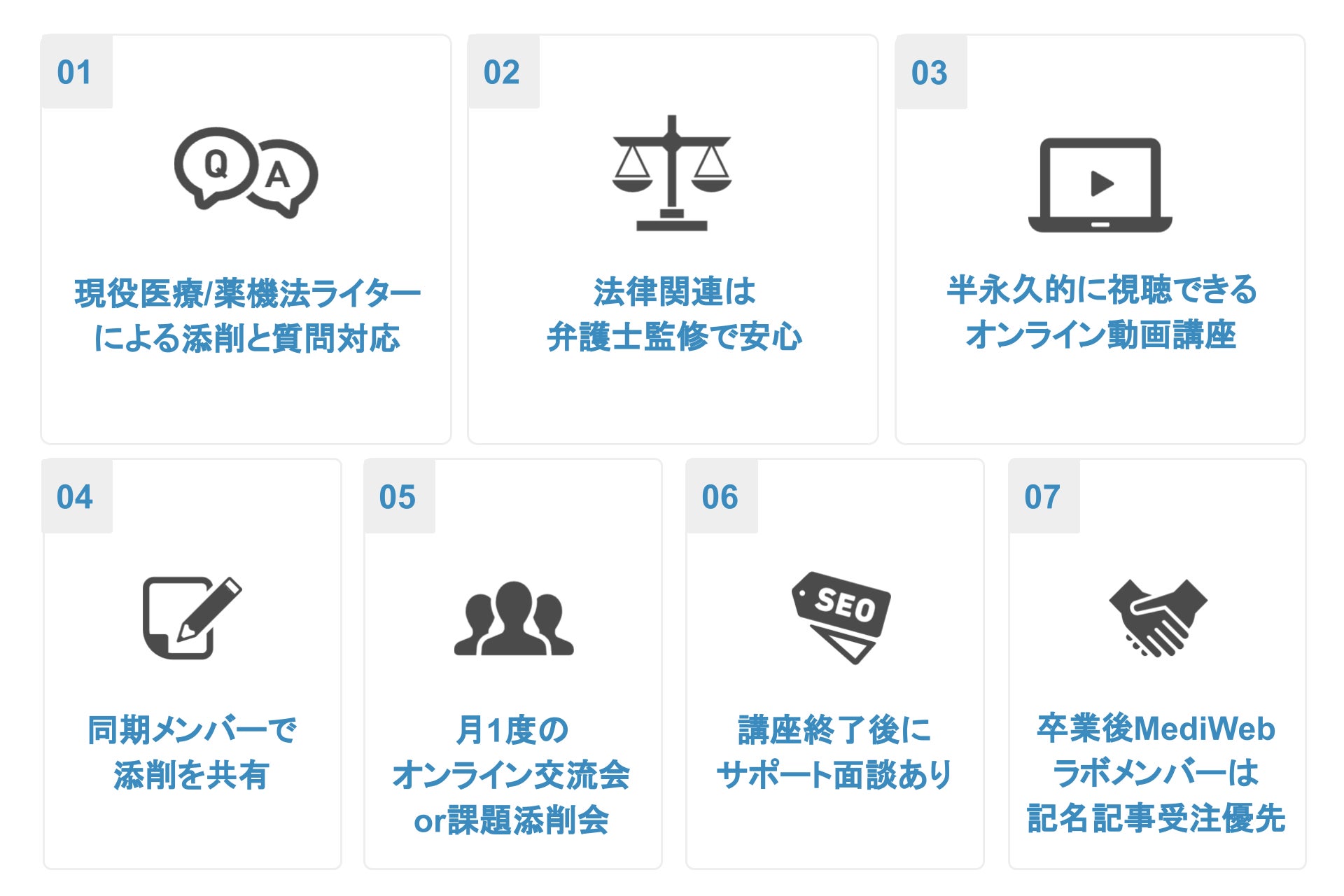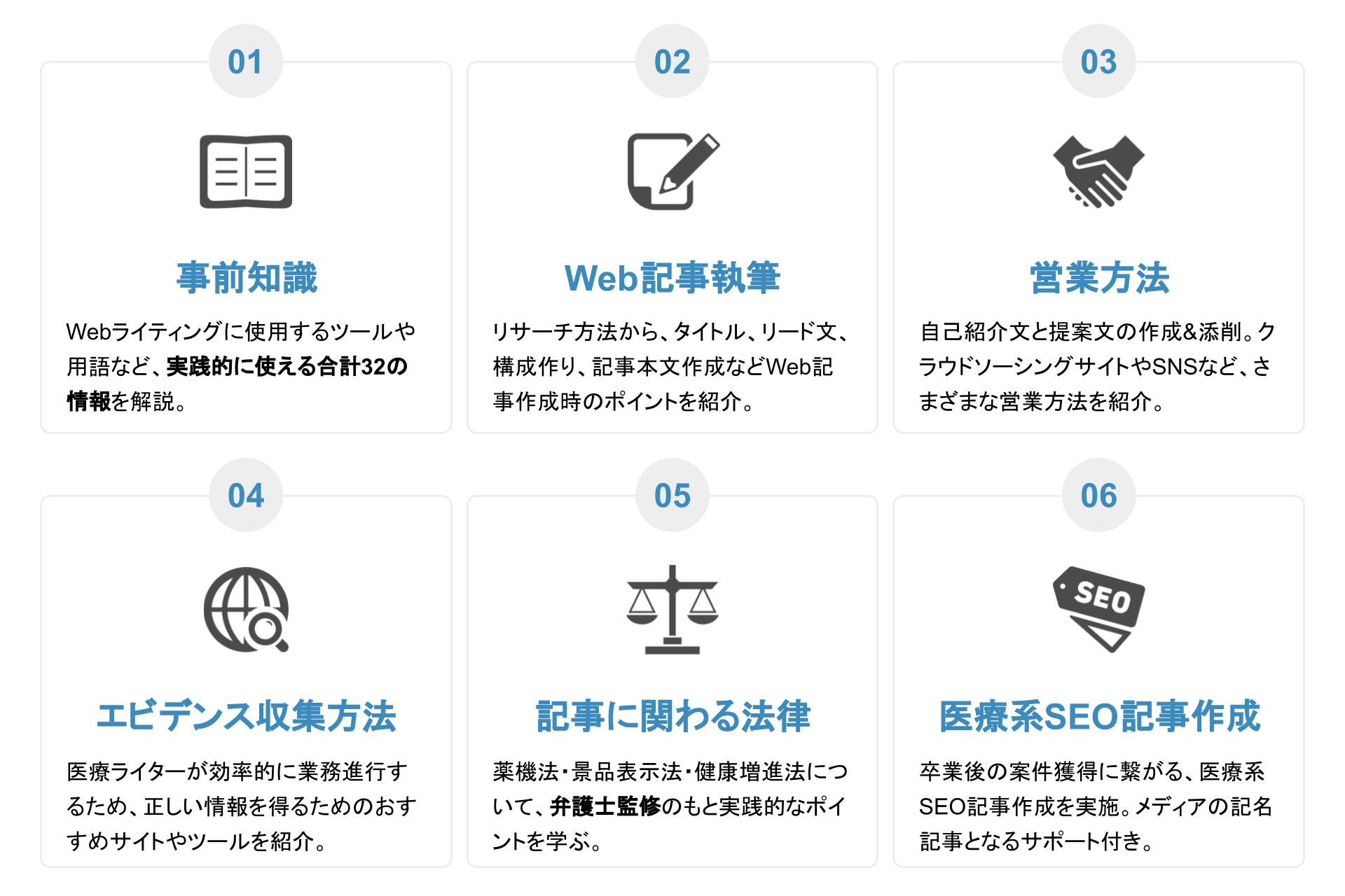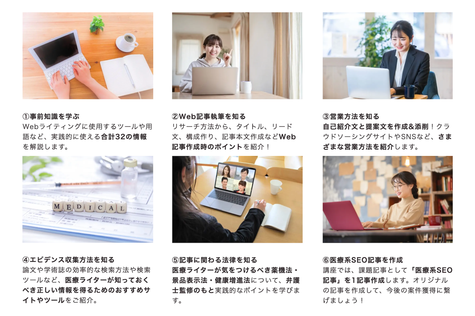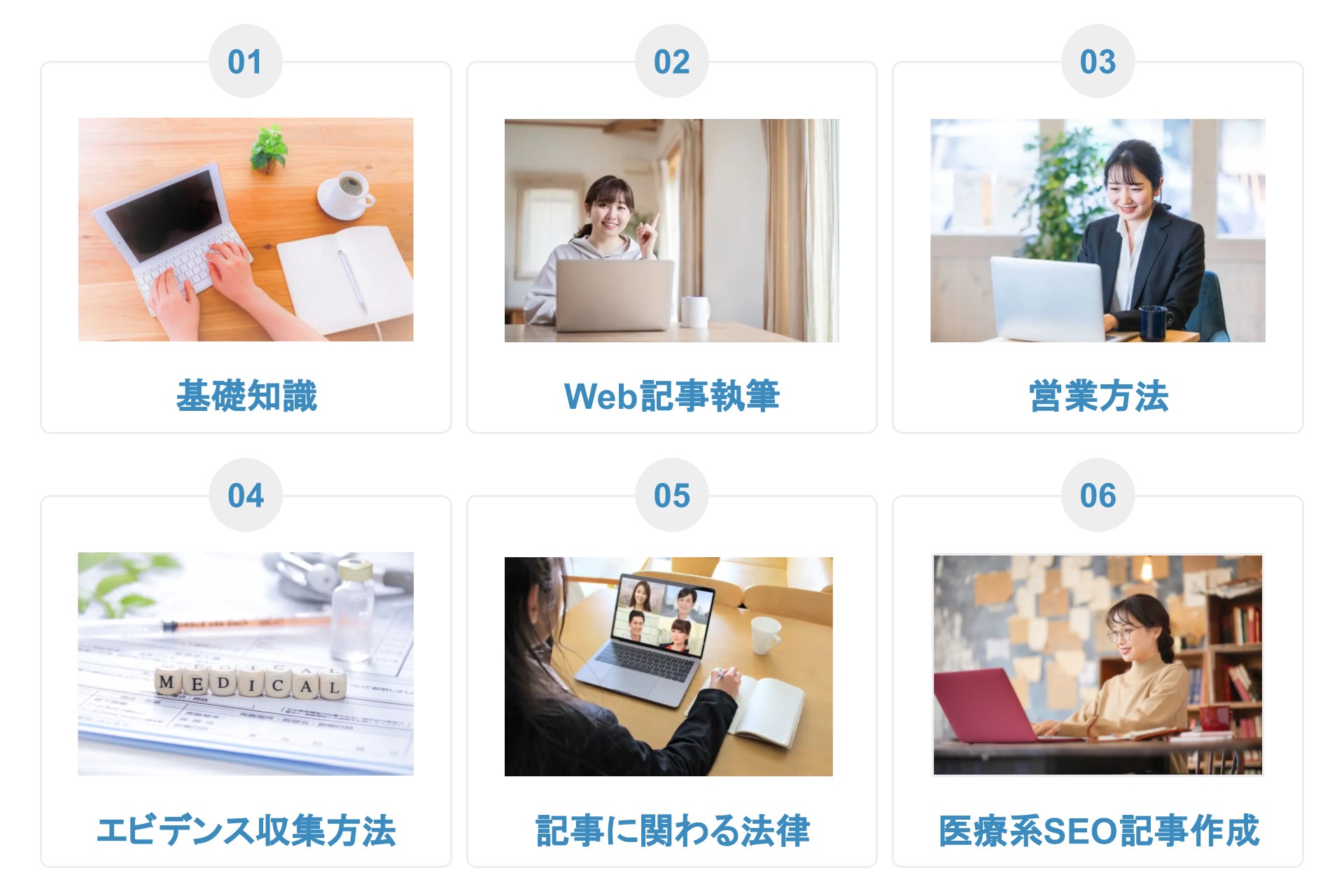 学べる内容:Webライティングの基礎・SEOライティング・営業方法・法律関係(薬機法/健康増進法/景品表示法)・医療系エビデンス収集方法・医療系SEO記事作成など