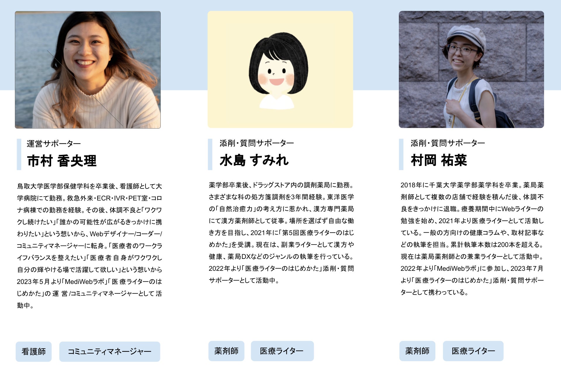 講座卒業後、医療×Webクリエイターのオンラインコミュニティ「MediWebラボ」に参加すると、「MediJump」で発信している初心者医療ライター向けの情報共有をテーマにした記名記事作成の案件を優先的に受けられます。この制度を利用して記名記事を増やし、新規案件獲得への助走をつける卒業生も多くいます。