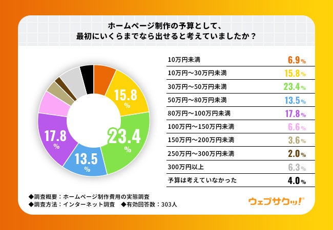 「ホームページ制作の予算として、最初にいくらまでなら出せると考えていましたか?」と質問したところ、『30万円〜50万円未満』が23.4%で最多となりました。次いで『80万円〜100万円未満』が17.8%、『10万円〜30万円未満』が15.8%と続きました。