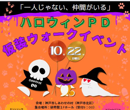 パーキンソン支援団体の「NPO法人コントロールPD」が、10月22日の日曜日に、神戸市北区しあわせの村で、ハロウィンPD 仮装ウォークを開催します。 現在200名のお申し込みがありますが、当日まで参加申し込みを延長しております。