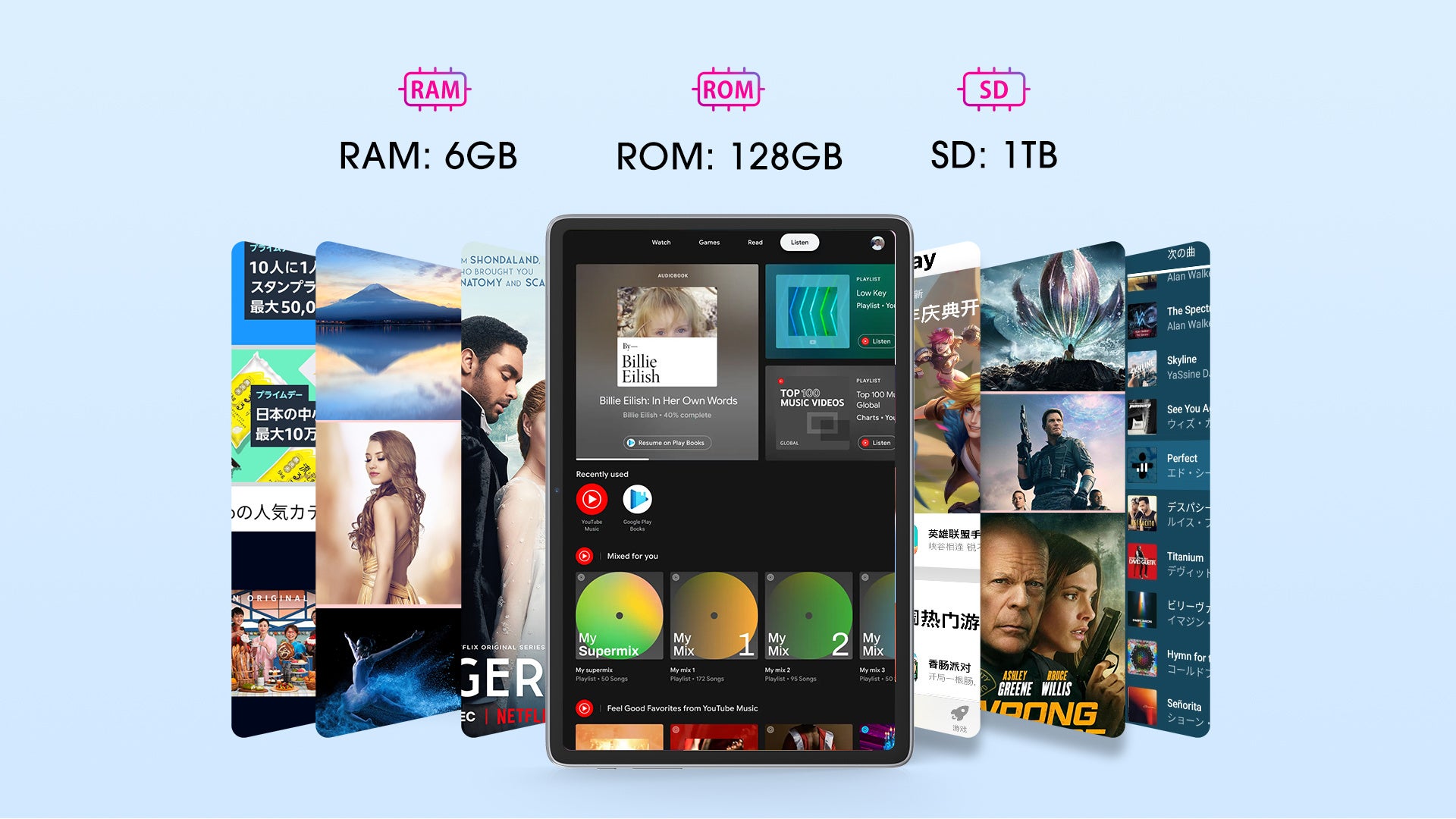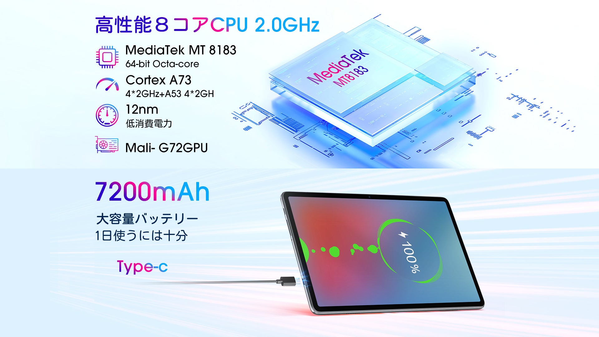 最新のAndroid 12が搭載されており、便利なユーザーインターフェースでより快適な操作が楽しめます。MediaTek製高性能 MT8183、8コア2.0Ghz CPUが搭載なので、少ない消費電力で高速な処理が可能です。GPUには高性能な「Mali-G72」を採用し、グラフィックス処理機能を強化しました。ケームや動画をよりスムーズにお楽しみいただけます。6GB RAMと128GBの高速ストレージを搭載し、アプリを素早く起動させます。更に1TBまでメモリーの拡張ができ、容量を気にせず動画や電子書籍、ゲームや音楽などがダウンロードできます。