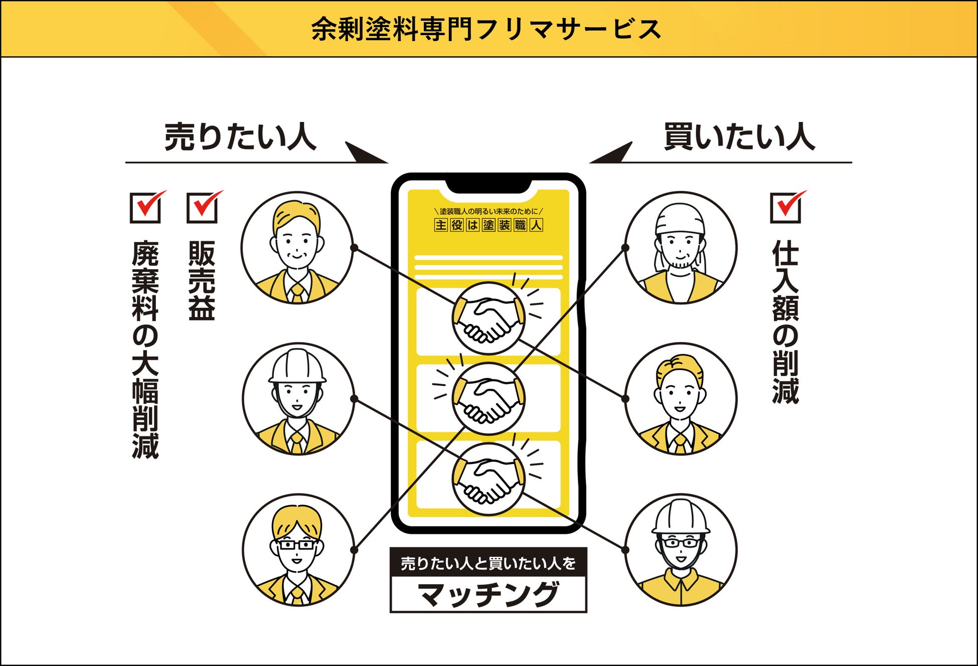 「主役は塗装職人」は、インターネットサイトを通じ、残塗料を廃棄せず活かしたい(売りたい)塗装業者と、塗料の仕入れコストをおさえたい(買いたい)塗装業者を結びつけるサービスです。
