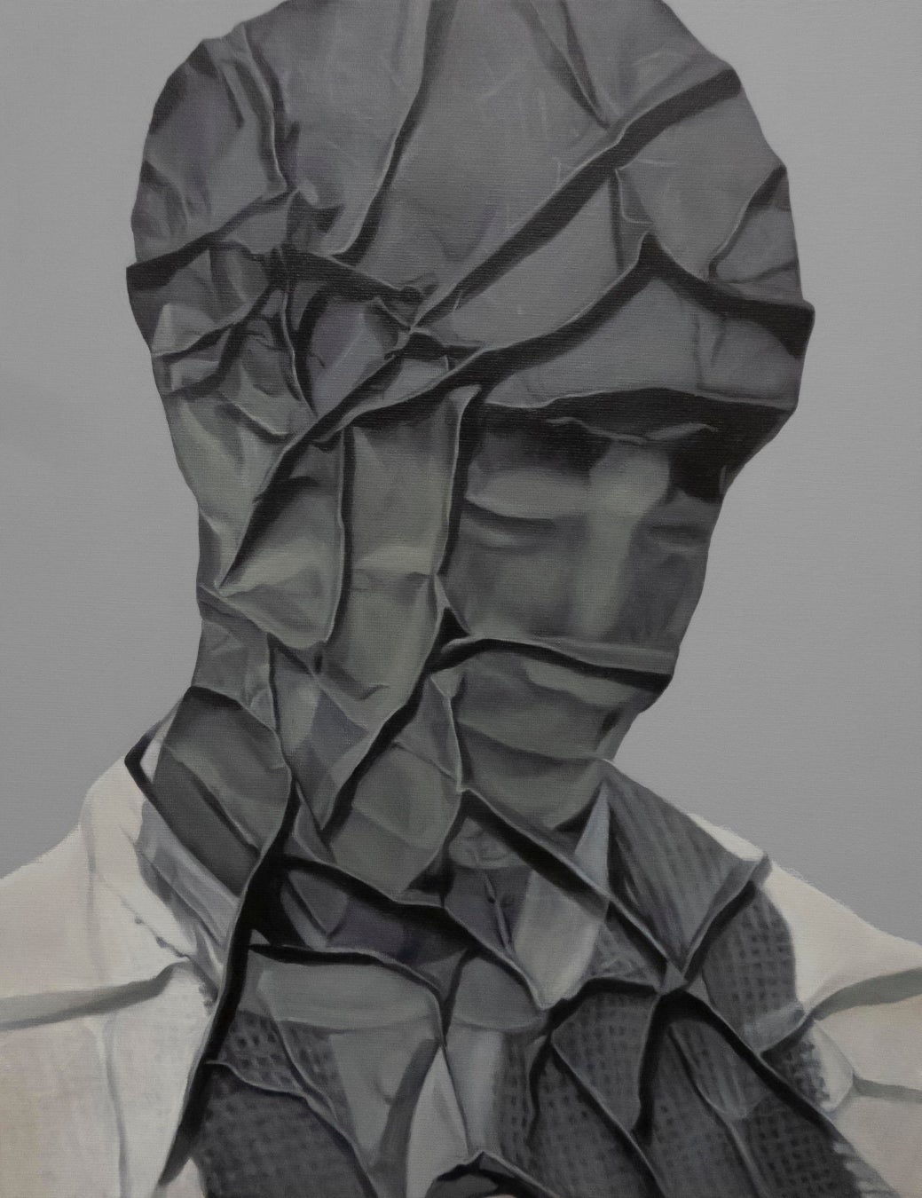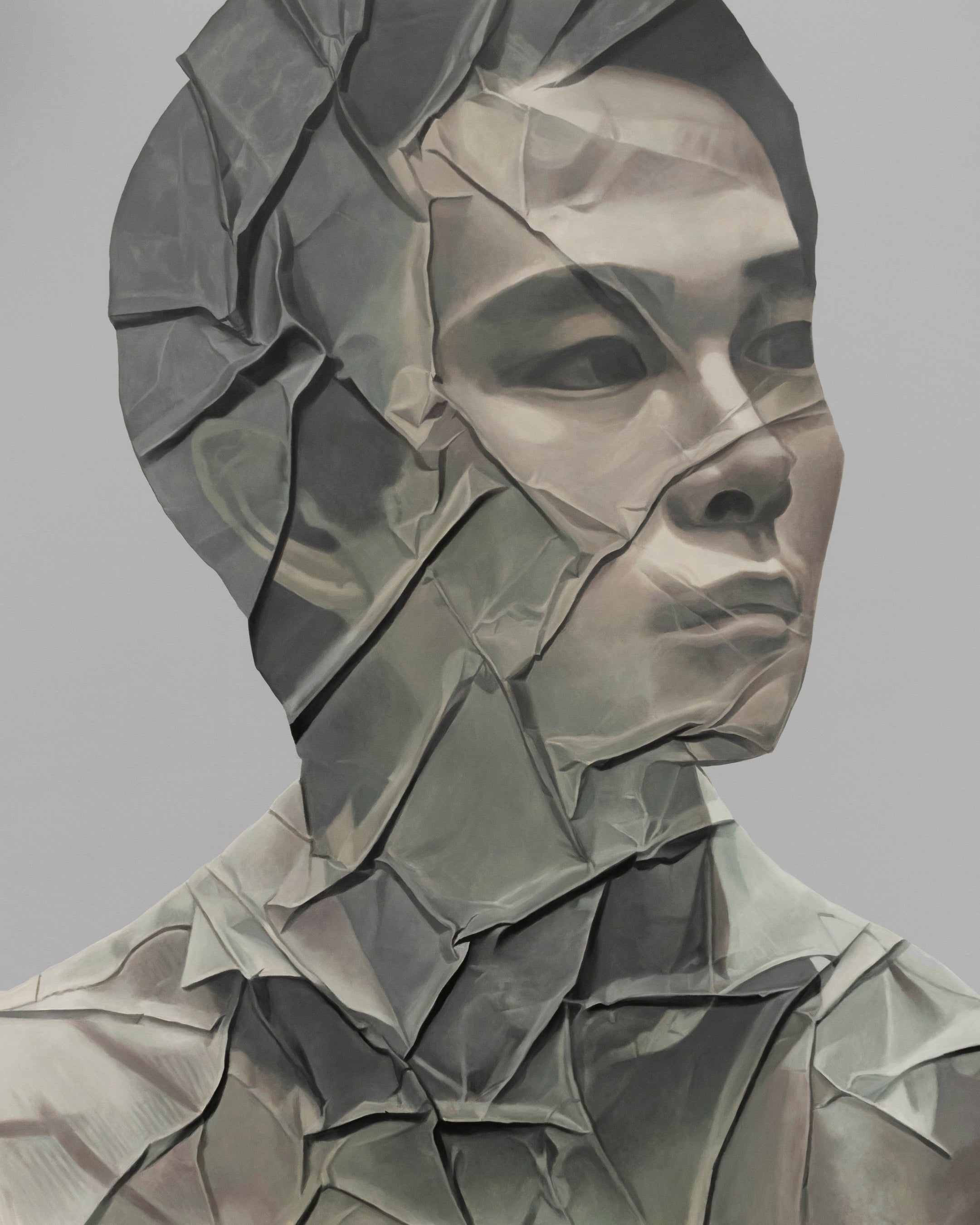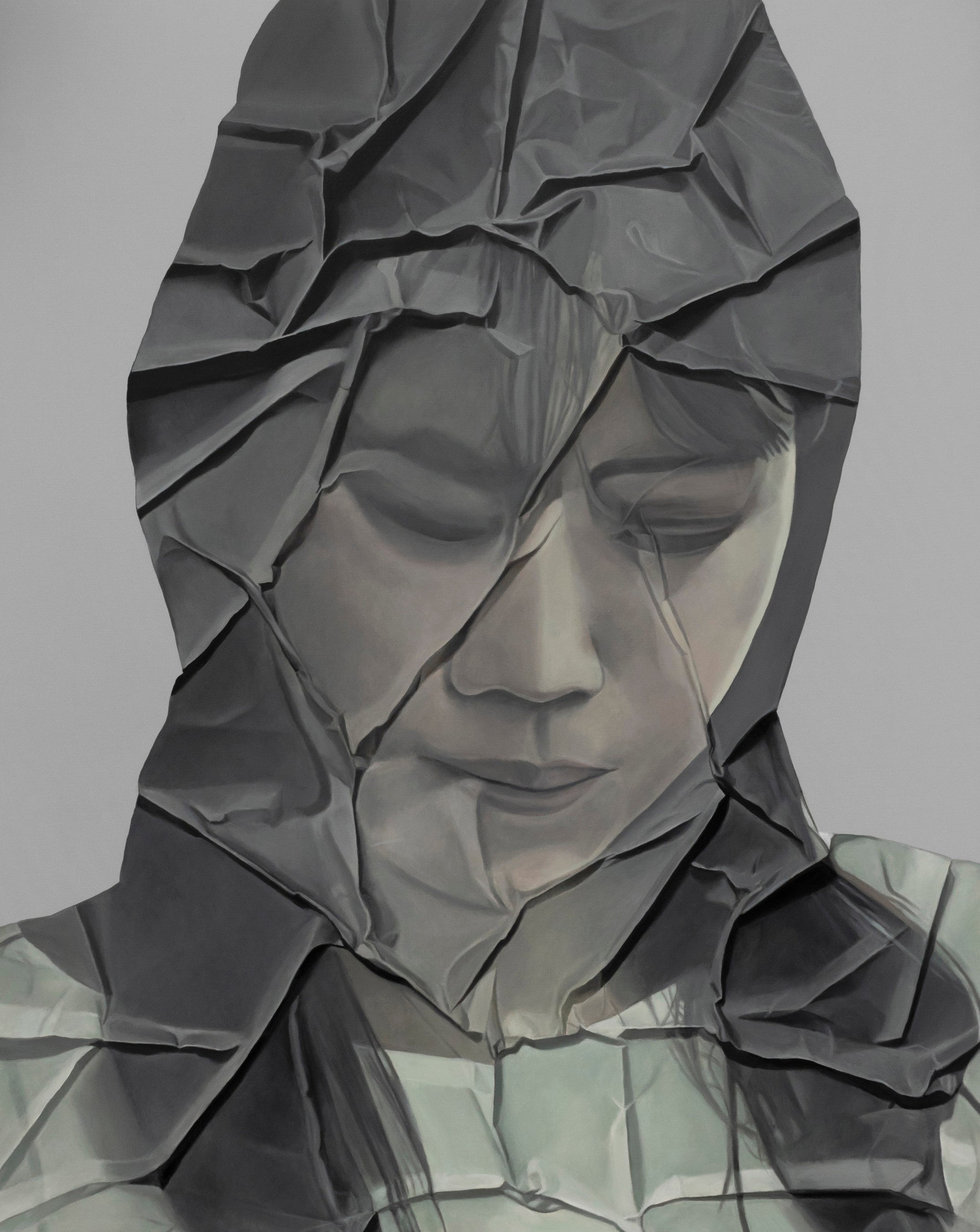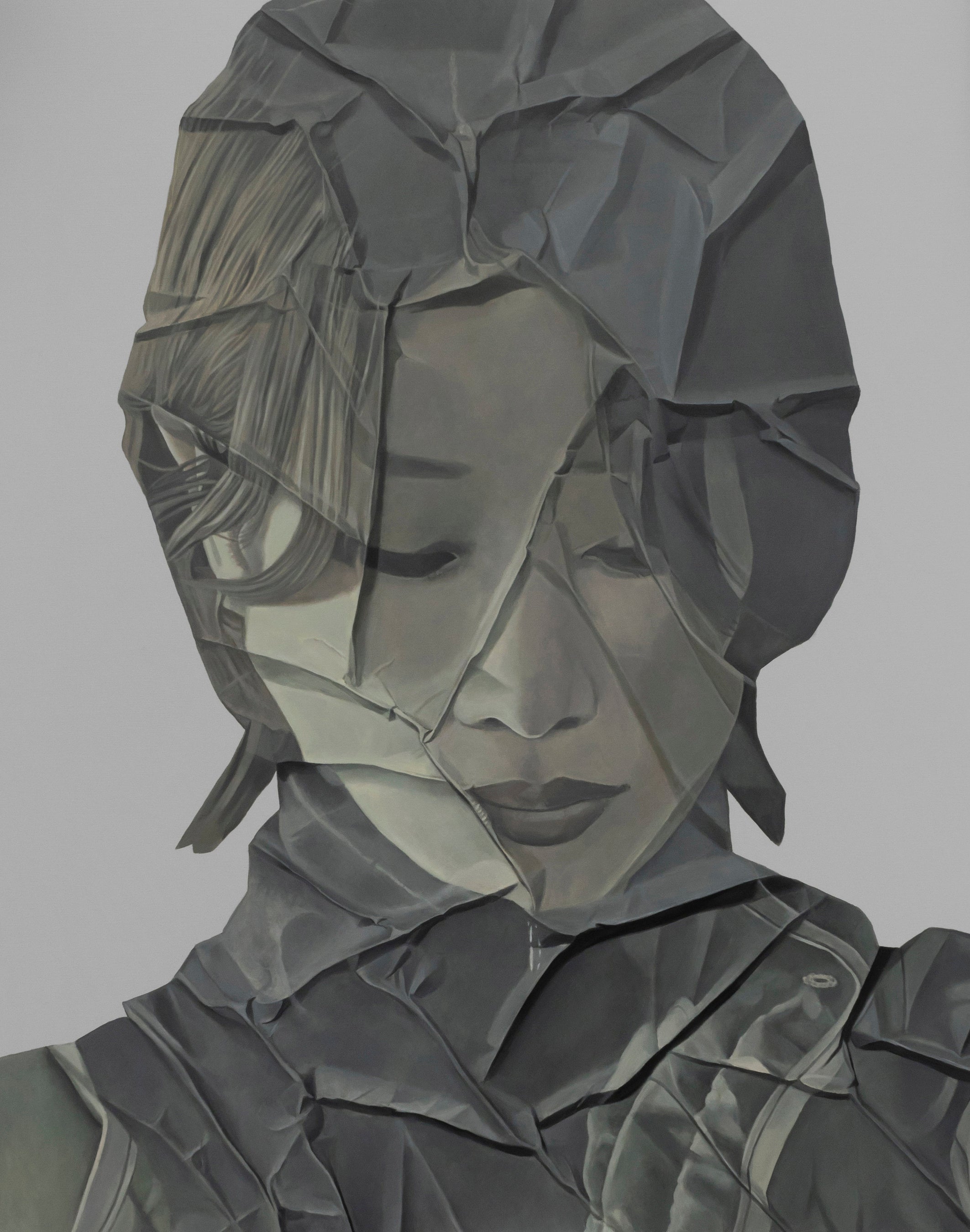 大西の制作過程ではインターネット上の誰もが自由にアクセス可能な人物写真を印刷し、自身の手でランダムに皺を加えた状態を撮影、ディスプレイに映しだしたデータをキャンバスに描きます。大西の描く人物はモデルを特定しないだけでなく、その性別、国籍について、視覚的な特徴をあえて埋没させるプロセスを経た後に、画面上に顕現します。
