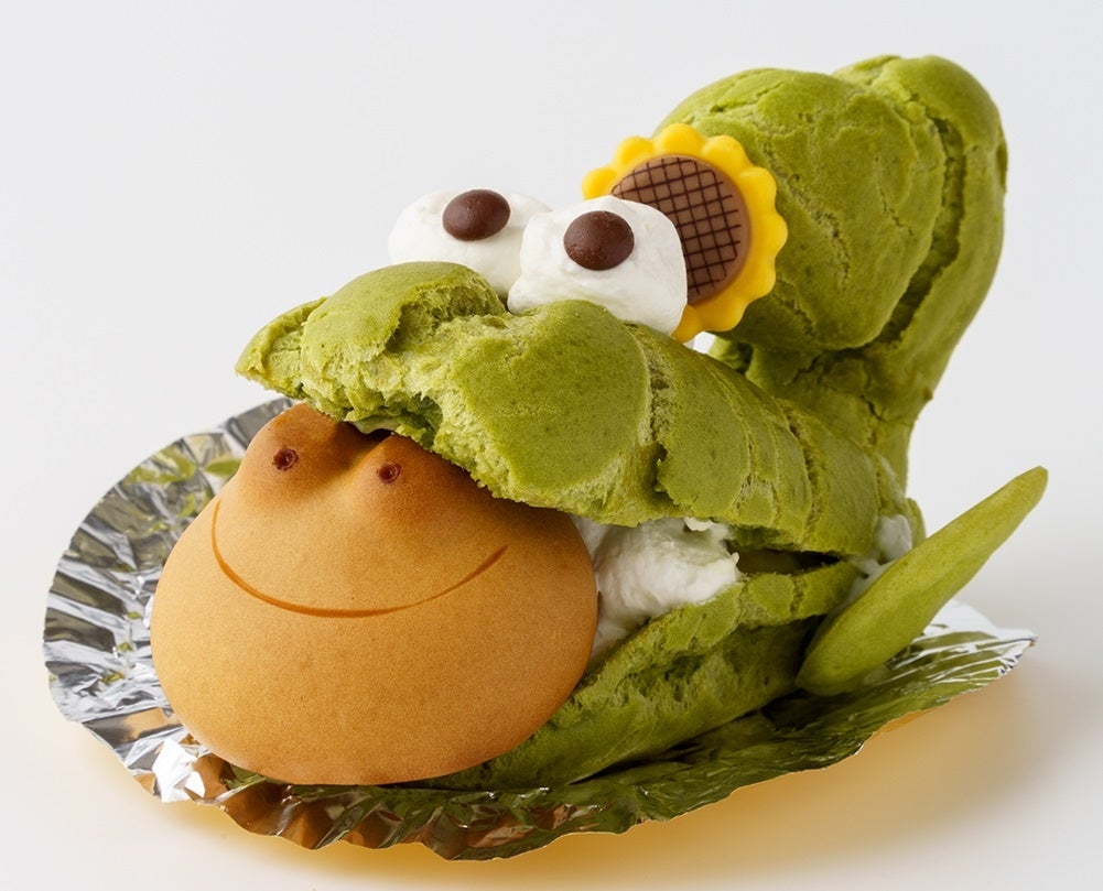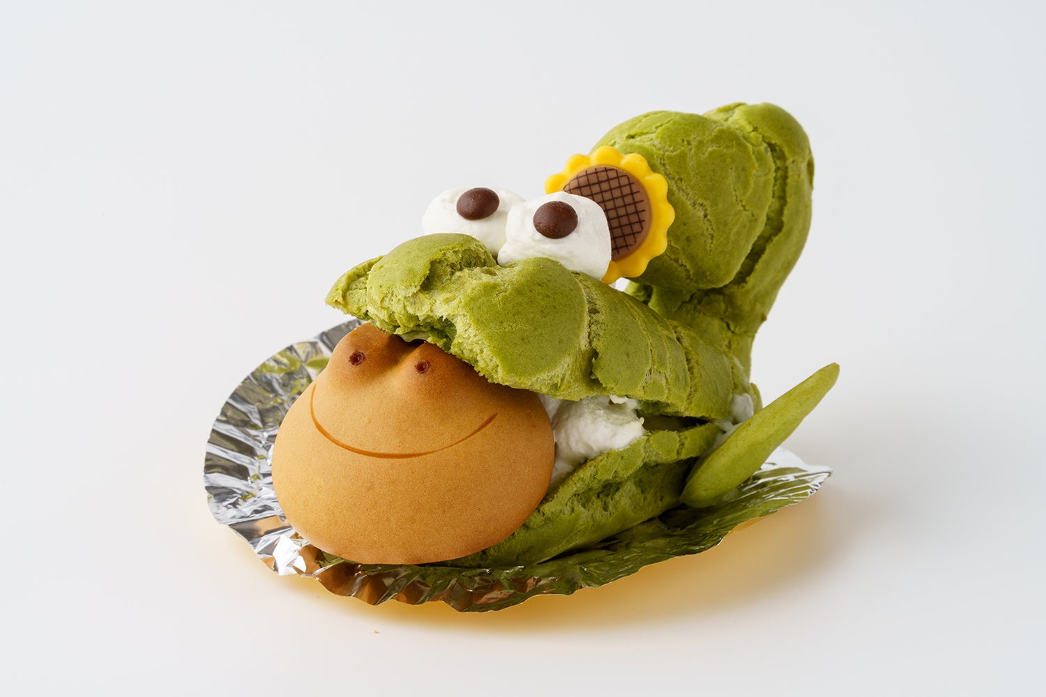 ほんのり抹茶風味の生地のシャチボンがこしあんたっぷりのカエルまんじゅうをくわえたインパクトのあるビジュアル