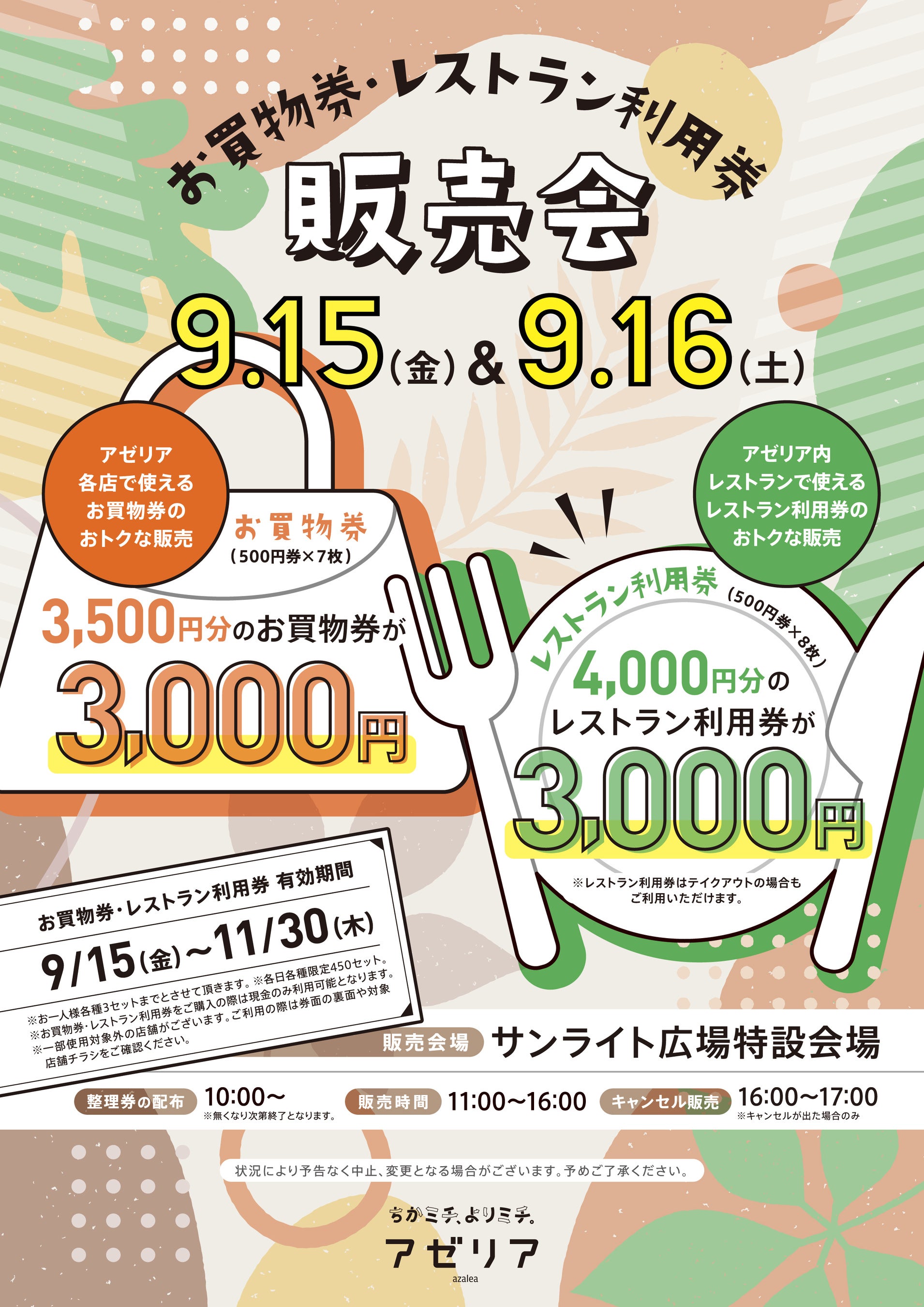 ③アゼリアお買物券・レストラン利用券販売会 開催期間:9月15日(金)・9月16日(土)