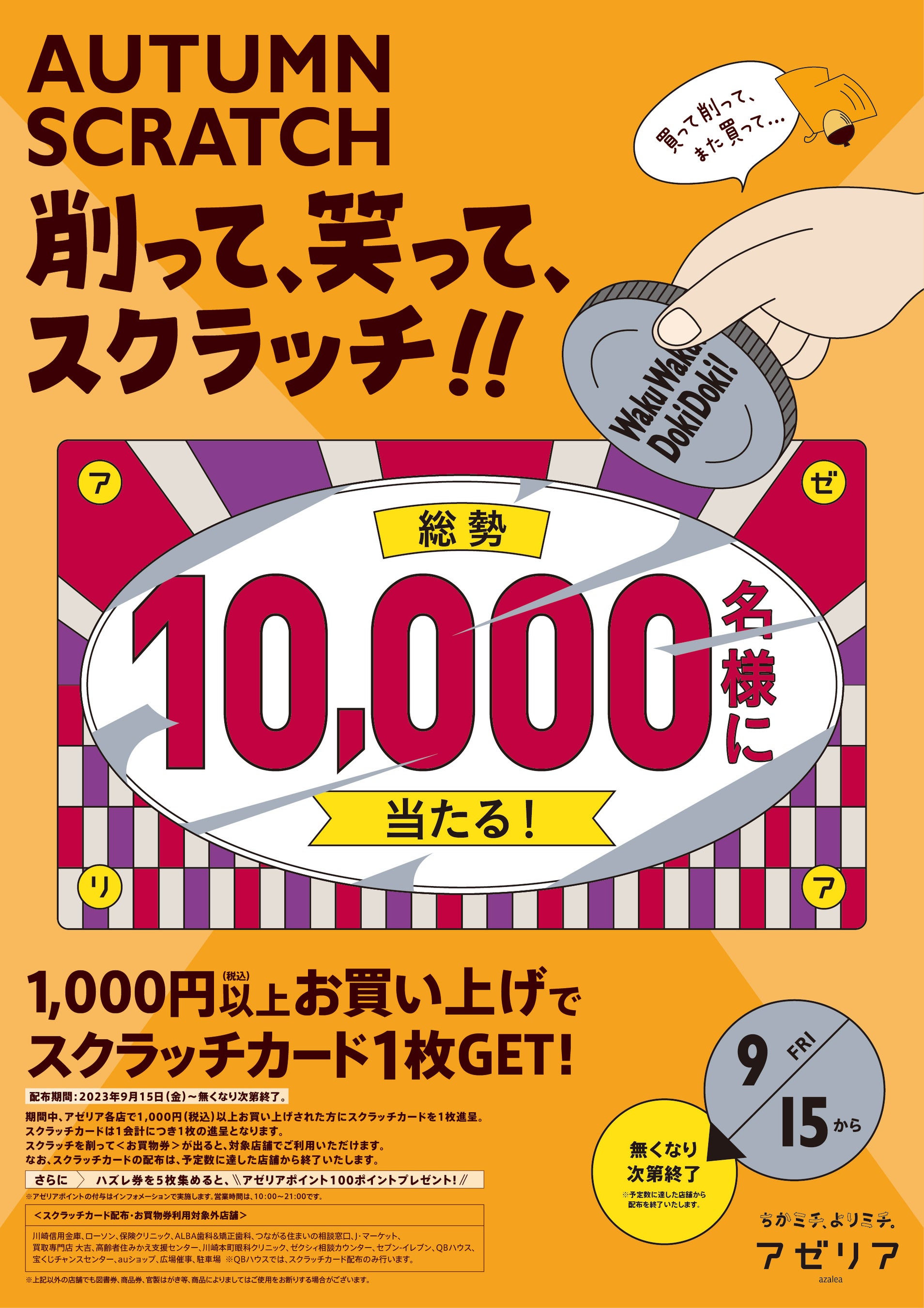 9月15日(金)より、アゼリア各店で1,000円(税込)以上お買い上げされた方にスクラッチカード1枚進呈。スクラッチを削って<お買物券>が出ると、対象店舗でご利用いただけます。さらに、ハズレ券を5枚集めると、アゼリアポイント100ポイントプレゼントいたします!
