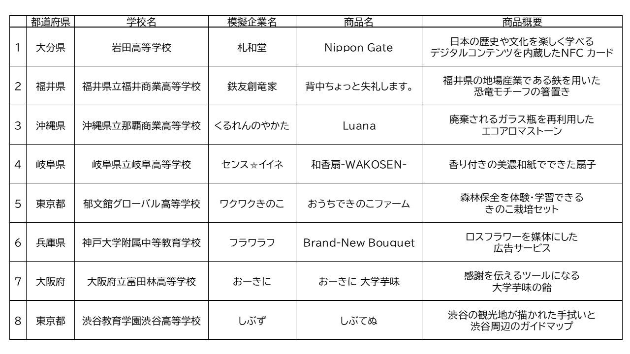 今大会は北海道から沖縄まで全国の高校から、84チームからのエントリーがありました。今大会で一次審査を通過したのは以下の8チームです。この8チームには30万円が貸与され、実際にビジネスを行います。(順不同)