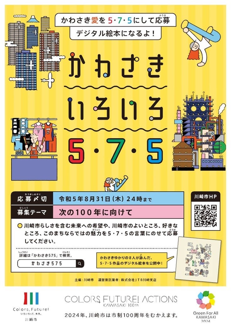 川崎市ブランドメッセージ「Colors,Future! いろいろって、未来。」の理念であり、川崎市の価値である「多様性」をより多くの方に共感を持って受け止めてもらい、市制100周年を契機に、さらに川崎市を好きになってもらうため、「かわさきのいろいろ」をテーマに、川崎市ゆかりの著名人等8人が詠んだ5・7・5の言葉に、イラストを添えたデジタル絵本を制作、WEB上に公開しました。また、川崎市のよいところ、好きなところを5・7・5の言葉で詠むことで、川崎市を知り、さらに好きになってもらうため、「次の100年に向けて」をテーマに広く作品募集を行います。