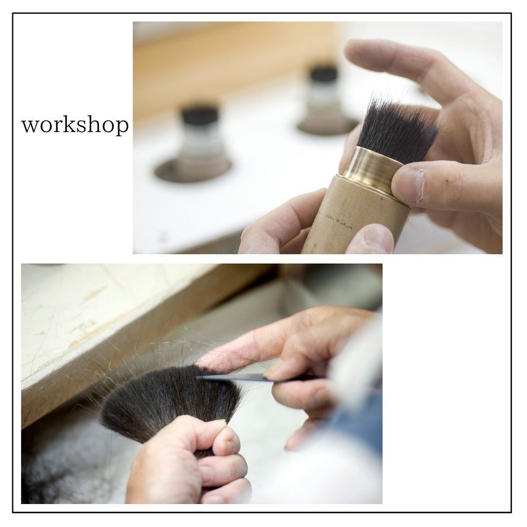 穂先が短い筆は肌へのあたりや、粉物の含みを重視しているため、馬毛や最高品質細光峰の山羊の毛を使用しています。