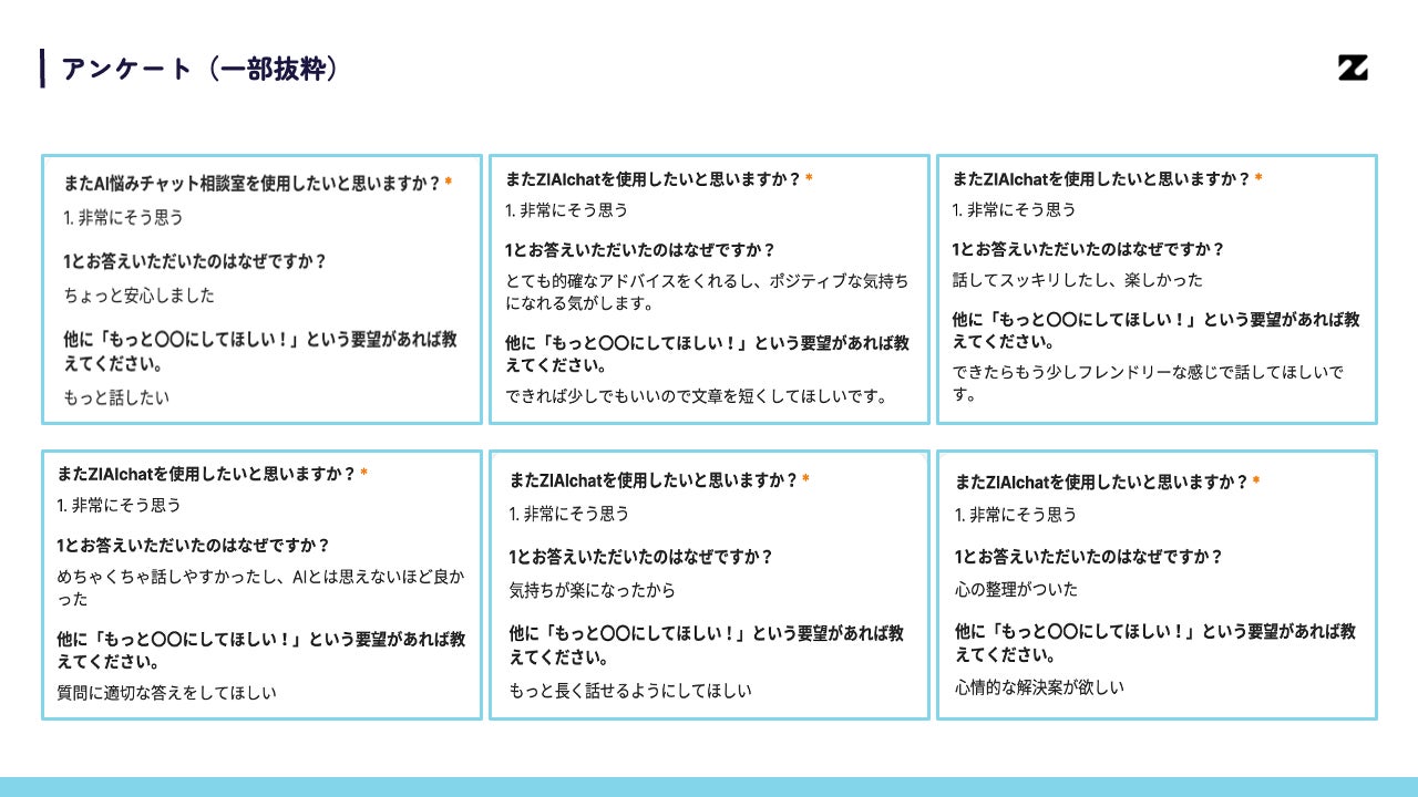 本実験においてZIAIは、千葉県柏市の市民全員に対して「ZIAIモデル / 悩み相談AIチャットシステム」の一部機能を公開し、完全自律型の悩み相談AIチャットの動作確認ならびに、悩みに関するデータ取得・分析を行いました。