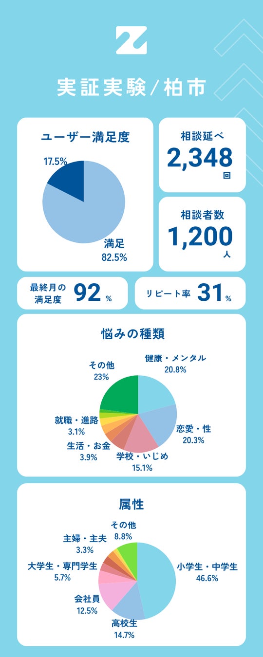 “カウンセリングの再発明”を掲げる株式会社ZIAI(所在地:東京都渋谷区 / 代表:櫻井 昌佳 / 以下、ZIAI)は、世界的に重要性が増すメンタルヘルス課題およびその受け皿となる行政の人手不足を解消する日本初の取り組みとして、千葉県柏市と提携した「ZIAIモデル / 悩み相談AIチャットシステム」の実証実験を実施しました。3ヶ月間で計2,348相談に対応し、平均満足度82.5%を記録。今後も継続して取り組みを進めていくことをお知らせいたします。