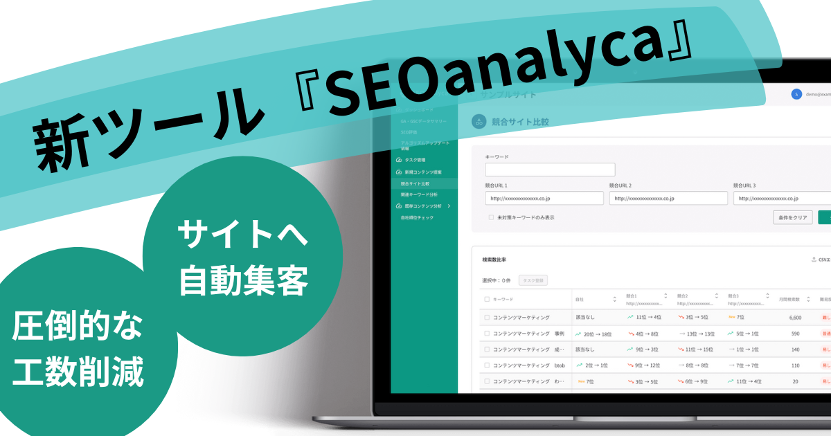弊社は、そのような企業のWeb担当者様の悩みを解決するため、誰でも手軽に再現性高く、サイトを上位表示できるコンテンツ制作ツール『SEOanalyca』を開発しました。