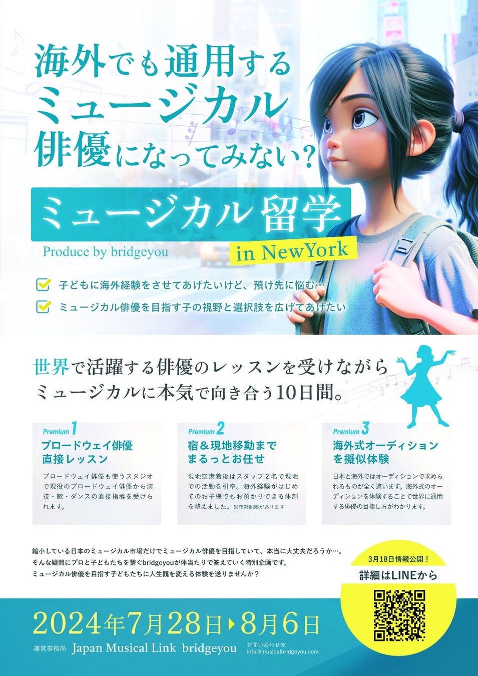 ミュージカル俳優育成を手掛けるJapanMusicalLink bridgeyouでは、元プロのミュージカル俳優が引率するミュージカル専門留学を、7月28日~8月6日の10日間NYにて開催します。