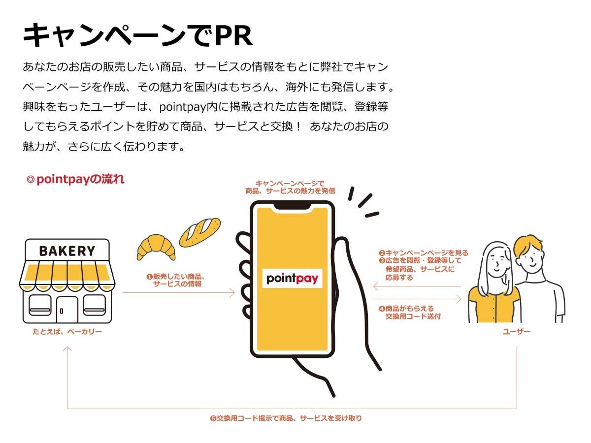 広告マーケティング、集客プロモーションを得意とする弊社が、あなたのお店の販売したい商品、サービスのキャンペーンを実施します。pointpayのユーザーは、サイトに掲載される広告を閲覧、登録などする度にポイントを獲得、そのポイントを使ってキャンペーン商品を手に入れることができます。さらに、広告登録で即キャンペーン商品を受け取れる特典もあります。pointpay最大の特徴は、あなたのお店の商品、サービスを無料で宣伝できることです。