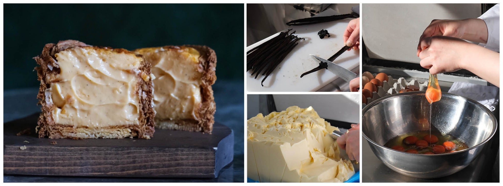 んで焼いたフランスの国民的おやつです。パケモンテでは「コントラスト」を商品コンセプトに、特殊技法を用いた多層からなる筒状のパイ生地にフラン液を流し込んで焼きあげ、パリサクとプルトロの2つの食感のコントラストを実現。長崎産の養鶏場直送の新鮮で濃厚な卵、フランス産発酵バター、バニラビーンズ、オリジナルブレンドの粉、ゲランドの塩など素材を厳選し、香料などは一切使用せずに無添加にこだわって旨みを引き出しました。パイ生地に4日間、フラン液に2日間をかけ手間を惜しまず丁寧に製造しています。