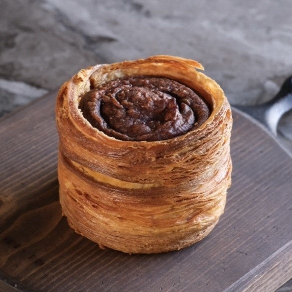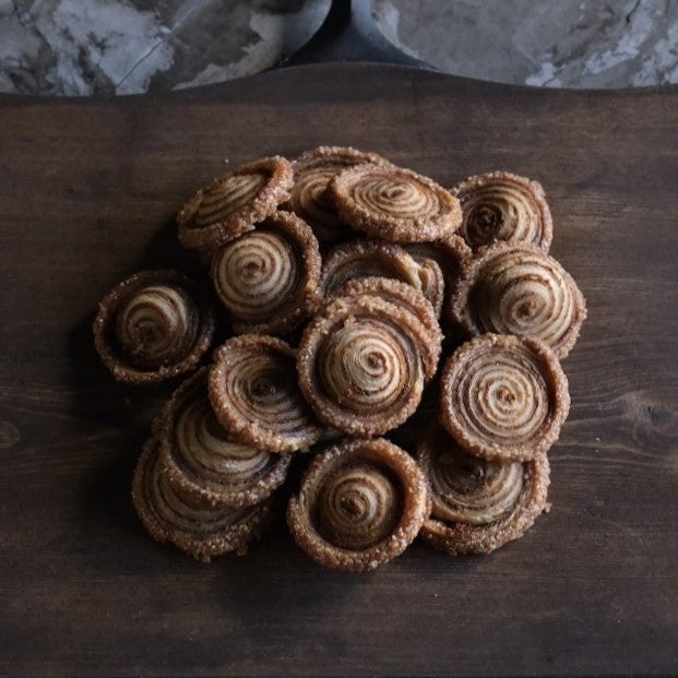 フランのまわりの生地にアーモンドクリームとシナモンをくるくる巻き込みフランス産カソナードをまぶして焼き上げるオリジナルフォルムのフランス菓子 パルミエ。