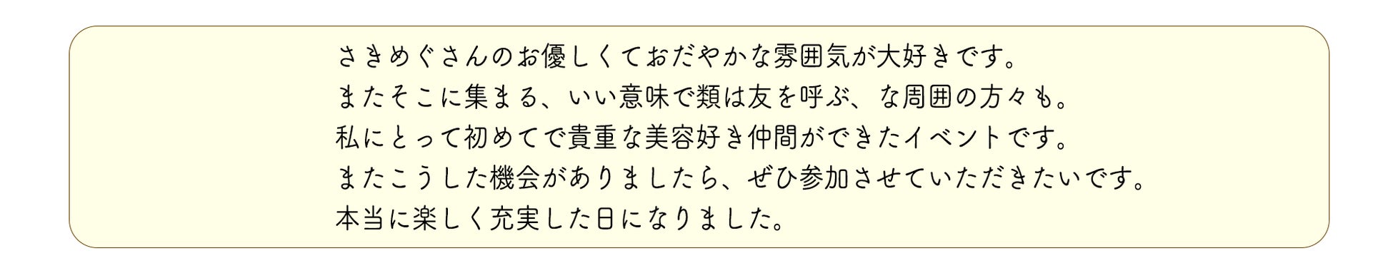 今回のイベントでは、化粧品原料の世界を実際に体験してもらうという咲丘の長年の夢が叶い、原料メーカーのオリジナル処方サンプルを特別に用意。ここでしか手に入らないプレゼントに参加者からも喜びの声が寄せられた。
