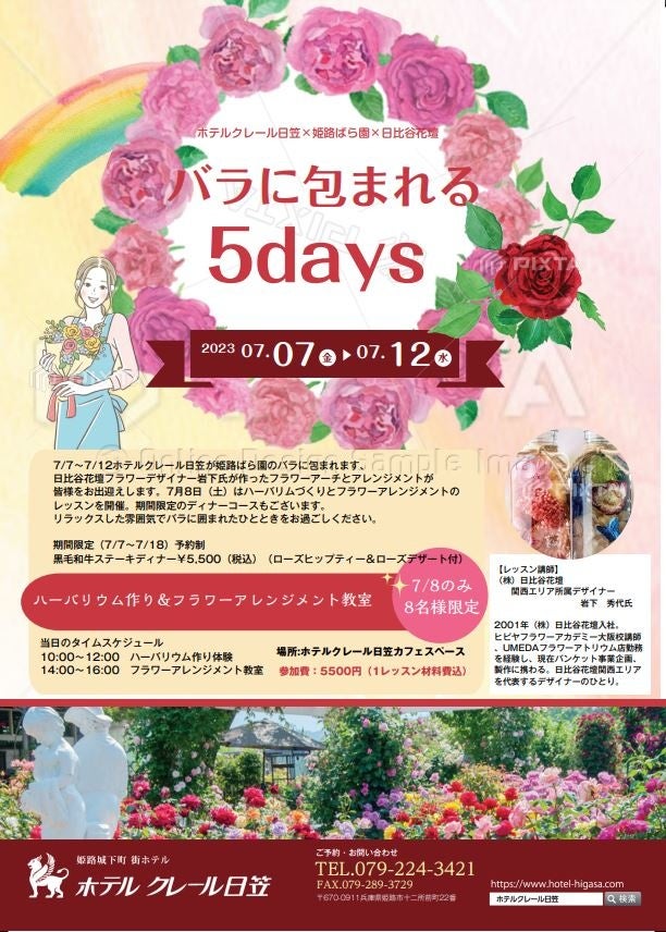 有限会社⽇笠(兵庫県姫路市⼗⼆所前町22、代表取締役 原 聡)が、ホテルクレール⽇笠にて⽇⽐⾕花壇・姫路ばら園とタイアップし、フラワーイベントを⾏います。