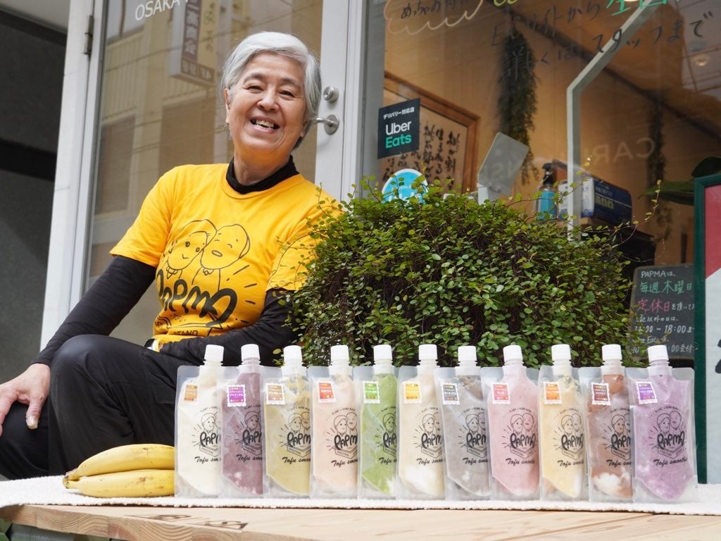 豆腐スムージー PAPMA(パプマ)の店主 町子ちゃん(75歳/右)と松ちゃん(74歳/左)の作るスムージーは「優しさのかたまり」と老若男女に大人気! 地元の方はもちろん、旅行で大阪に来られた方や、通りすがりの方まで幸せにできる「シニアならではの癒し力」がスムージーと合わさりSNSでも大人気!
