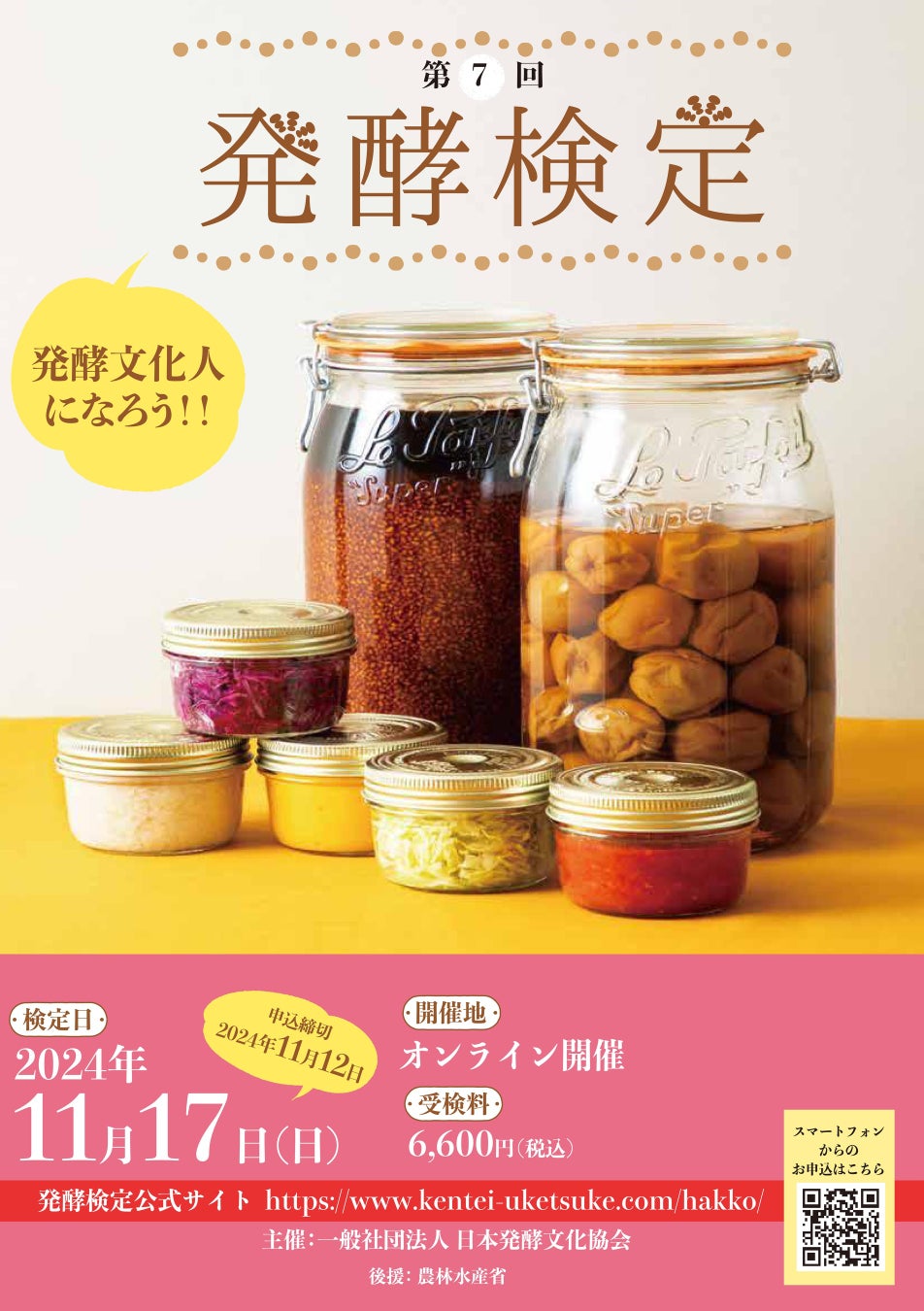 「発酵で日本を繋ぐ!」をテーマに日本の伝統食文化である発酵の素晴らしさを次世代へ継承していくため、様々な活動を続ける一般社団法人日本発酵文化協会(所在地:東京都目黒区 代表理事:横山貴子)は、発酵検定を主催いたします。2024年11月17日(日)にオンラインにて第7回発酵検定を開催するため、7月3日(水)より公式サイトにて申し込み受付をスタートいたします。