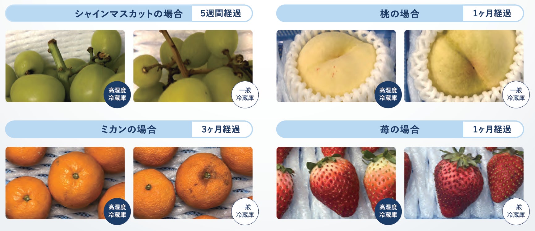 長期鮮度保持の一例としてシャインマスカットの場合、3か月の鮮度保持が可能です。
