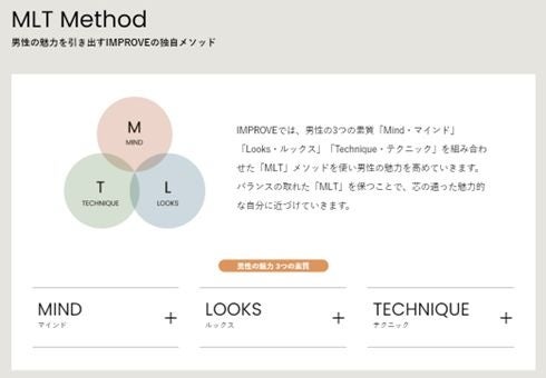 IMPROVEは内面と外見の両方から男性の魅力を高めていくプログラムです。プログラムは3つの素質「Mind・マインド」「Looks・ルックス」「Technique・テクニック」を組み合わせた「MLT」メソッドを使います。