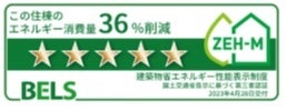 また、「BELS(建築物省エネ法に基づく省エネ性能表示制度)」による第三者認証でも最上級の五つ星を全住戸で取得。一次エネルギー消費量を住棟全体で36%削減する設計仕様となっており、健康や家計、環境にやさしい住まいづくりを目指しています。