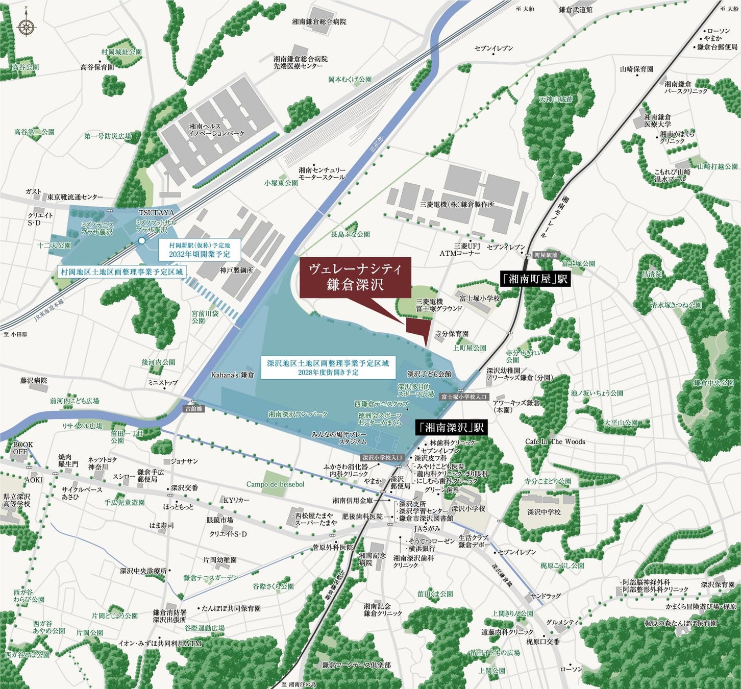 「湘南深沢」駅前に広がる深沢地区土地区画整理事業予定区域は、「鎌倉」駅「大船」駅周辺に次ぐ“第三の都市拠点”に位置付け、鎌倉市本庁舎を移転する方針を決定し、商業・住宅・公園等約31haの事業です。「ウェルネス」をテーマに、その第一歩として身体と心の健康につながり、新しい出逢いや交流を生む“ウォーカブル=歩きやすい、歩きたくなる環境創造”を目指します。『SDGs共生未来都市』として2028年度に街開きを予定しており、ワークライフバランスのモデル都市ともなりうるエリアです。