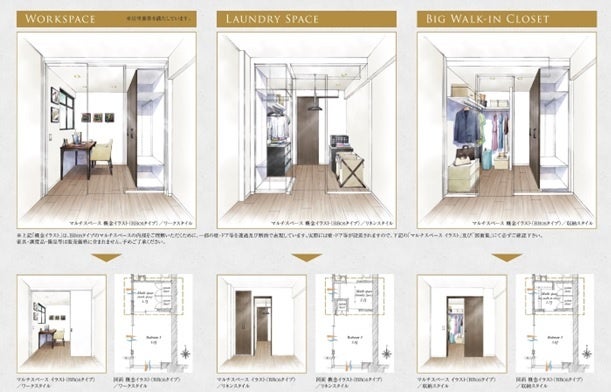 奥行約4m、広さ約10畳の「オープンエアリビングバルコニー」を始め、室内空間とフラットにつながる開放的で多彩なバルコニーを各プランに採用。さらに、暮らしを便利に楽しく進化させる多目的スペースを一部住戸に採用し「ワークスペース」「ランドリースペース」「ビッグウォークインクロゼット」の3種類から選択可能にしました。(有償/申込期限有)