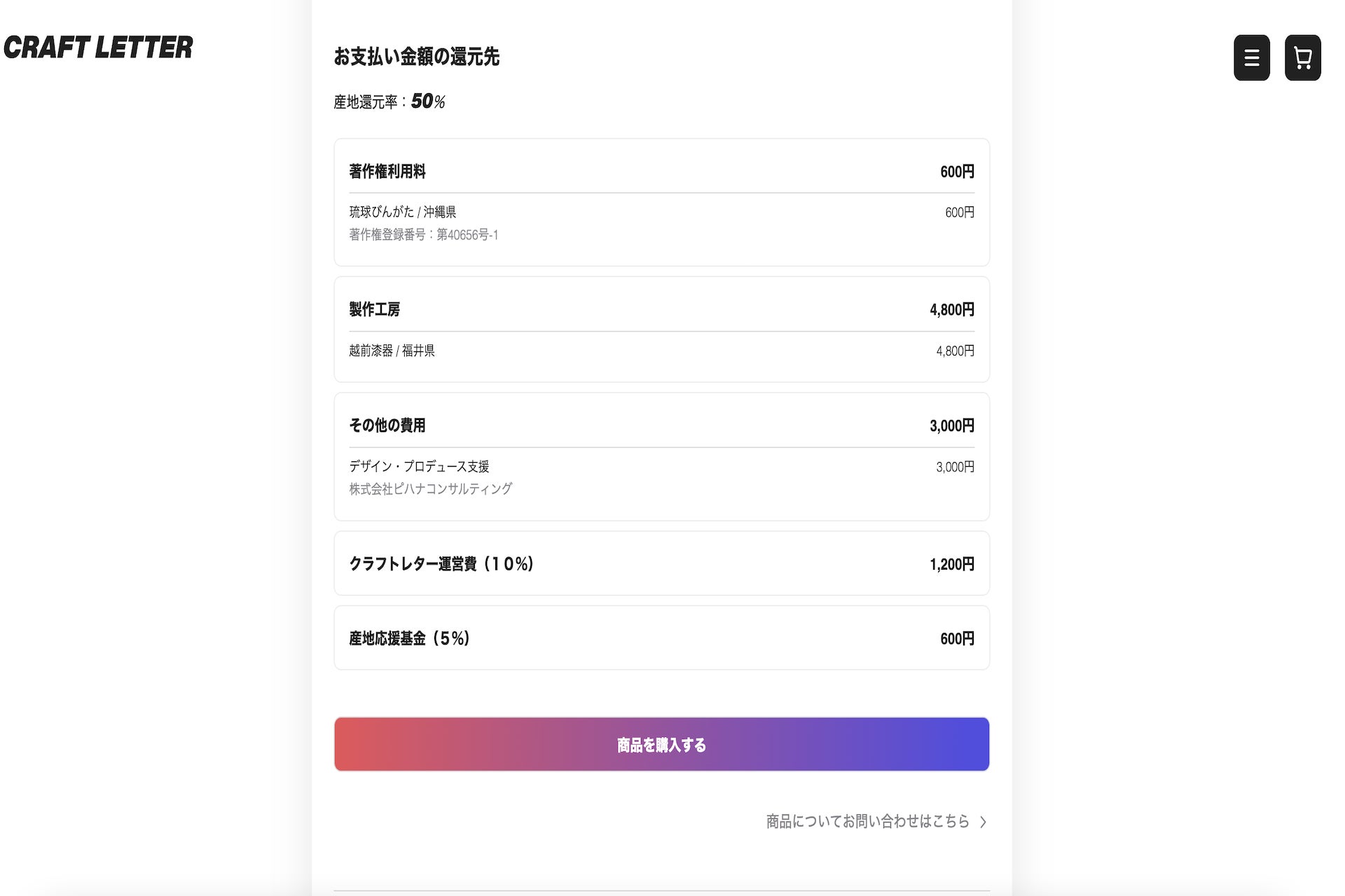 クラフトレターで販売するプロダクトには、日本の伝統工芸品の製造に携わるステークホルダーへの還元額を明示しています。工芸品を購入することで、還元されている額を把握しながら工芸産地を応援できます。特徴としては都度5%の産地応援基金を設けています。