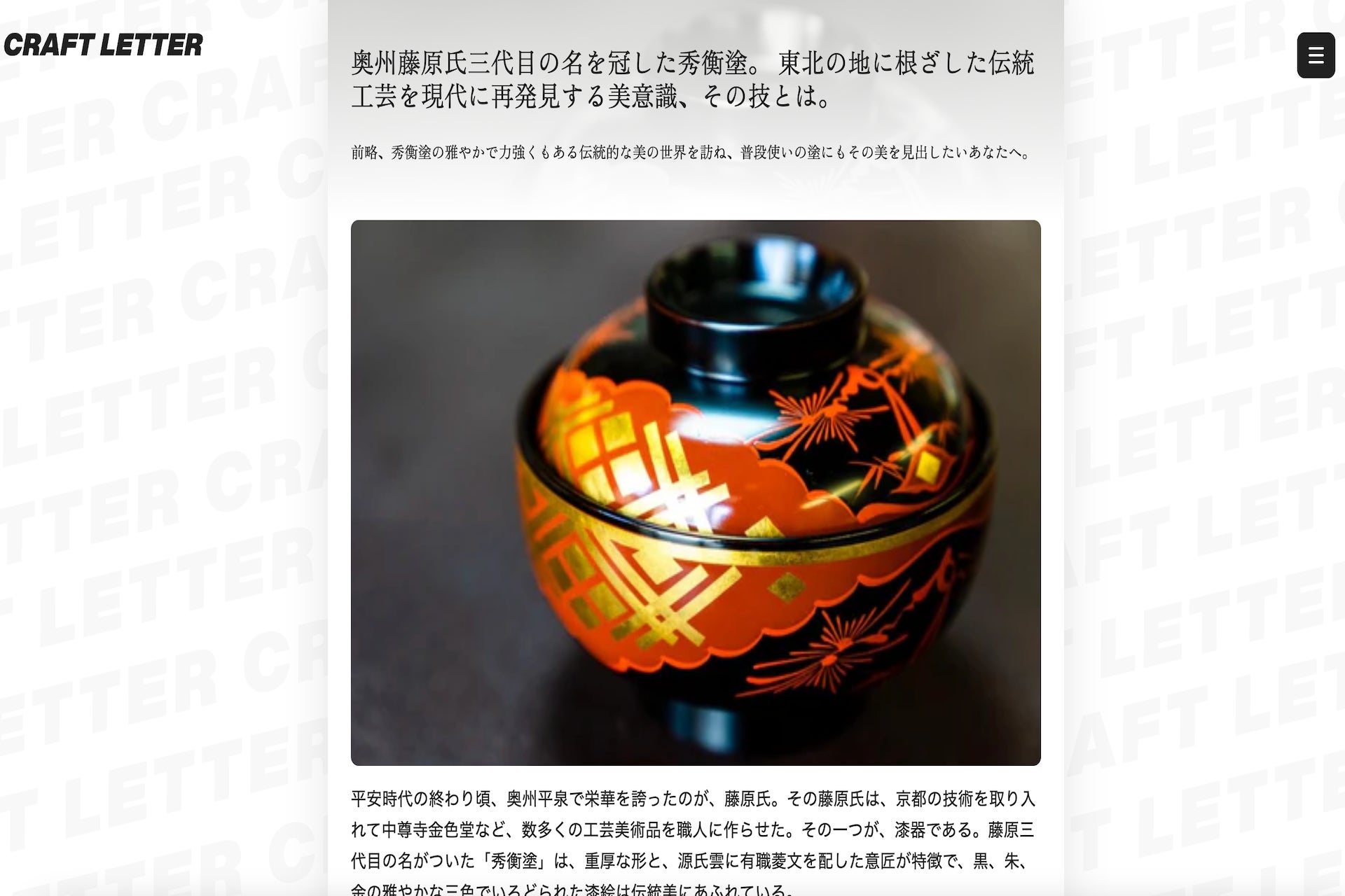 日本全国の伝統工芸産地の魅力を伝える記事を掲載しています。職人の背景や想い、工芸品の技法や原材料について、地域ごとに丁寧に取材した内容を展開しています。