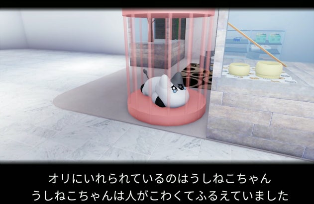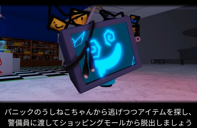 とあるショッピングモールのペットショップ、そこでは臆病で不思議な生き物「うしねこちゃん」が震えていました。 ある時、突如落雷による停電が発生、慌てて走り出してしまううしねこちゃん、うっかりテレビにぶつかってそれを被ってしまいます。より一層パニックになって暴れるうしねこちゃん。暴れるうしねこちゃんから逃げて無事にショッピングモールを脱出してください。