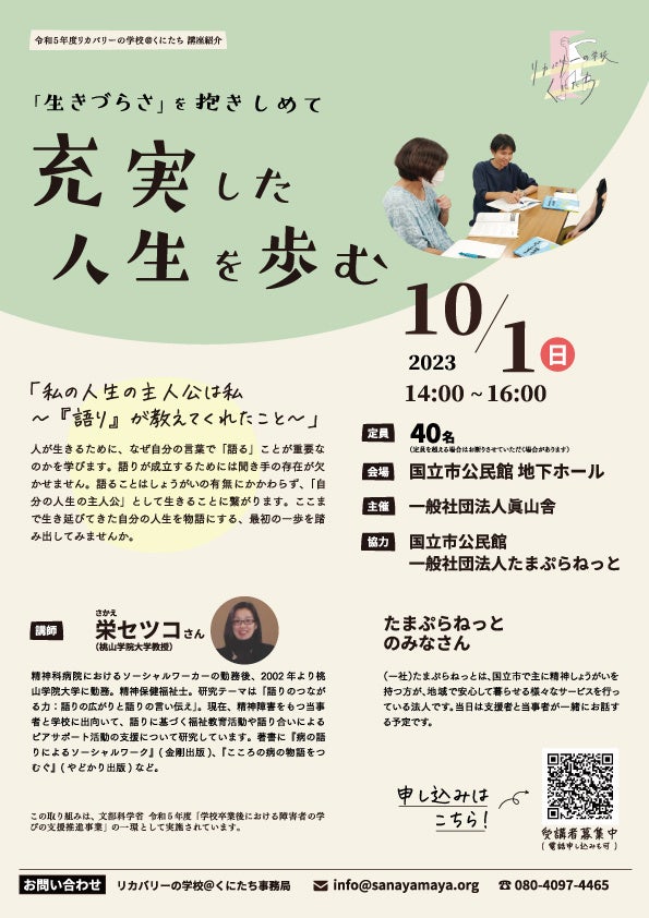 講座では、人生の主人公は「私」であるという視点による「語り」について、栄氏から講義があります。また、たまぷらねっとの皆さんによる語りや表現展示(絵、写真、詩)が行われる予定です。