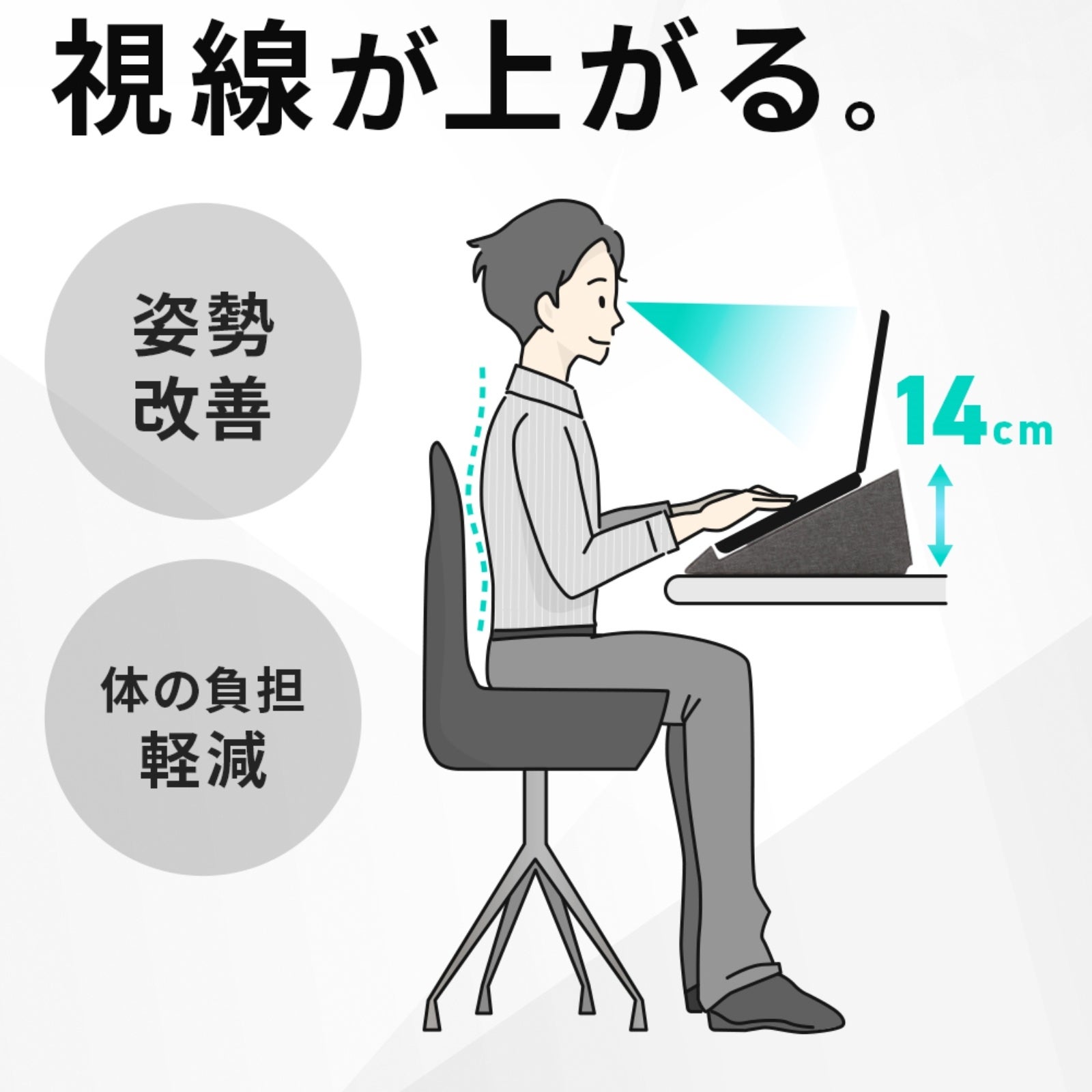 超軽量ながらノートパソコンの高さを14cm上げることができます。視線が上がり作業姿勢も改善。眼の疲れや肩こり、腰痛の低減、猫背改善につながります。